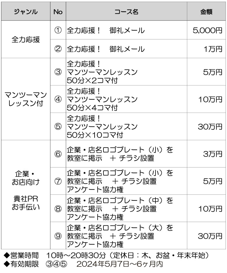 ③〜⑤:マンツーマンレッスンクーポン(利用開始時期:5月7日〜) 発送:4月中旬