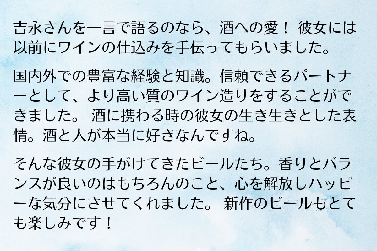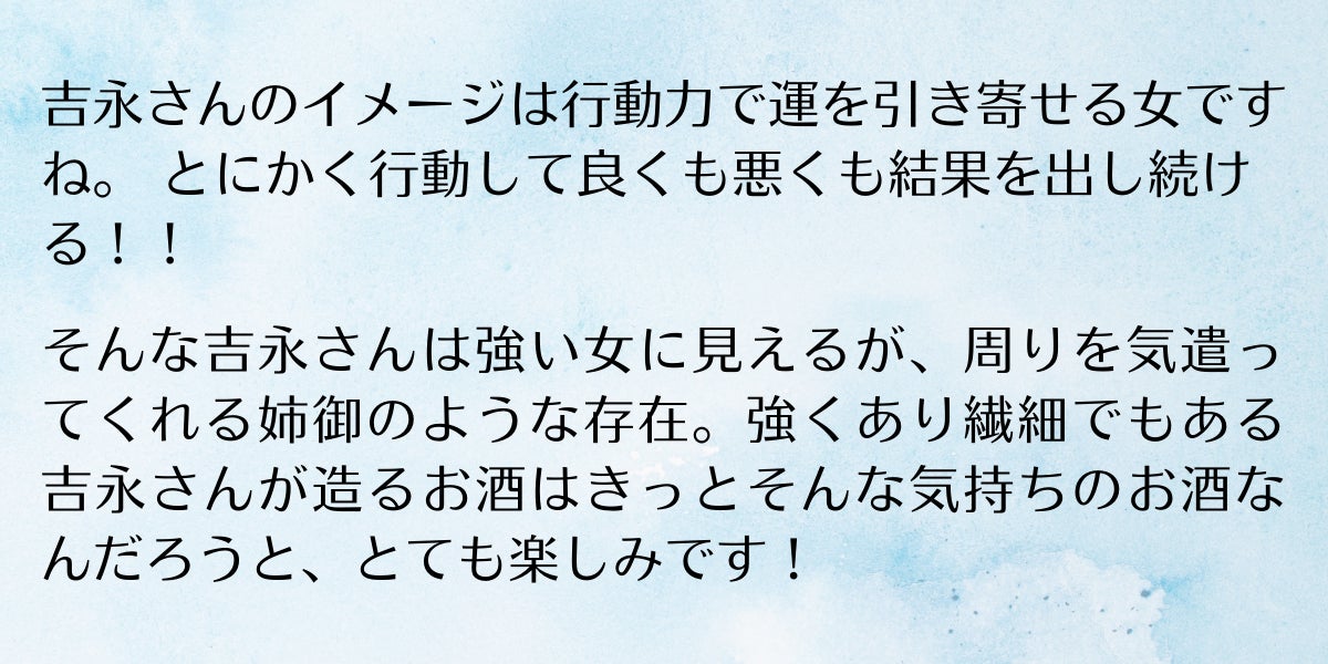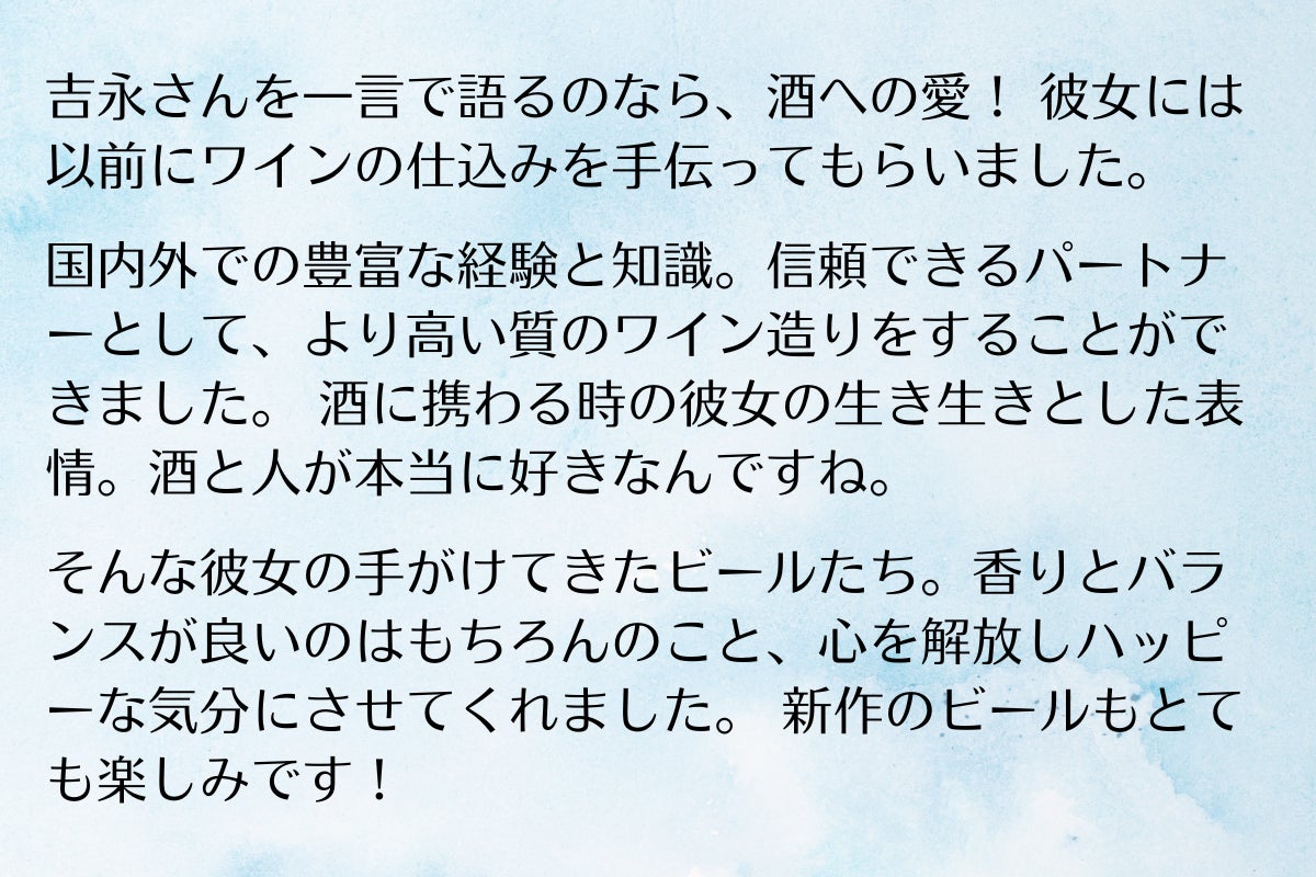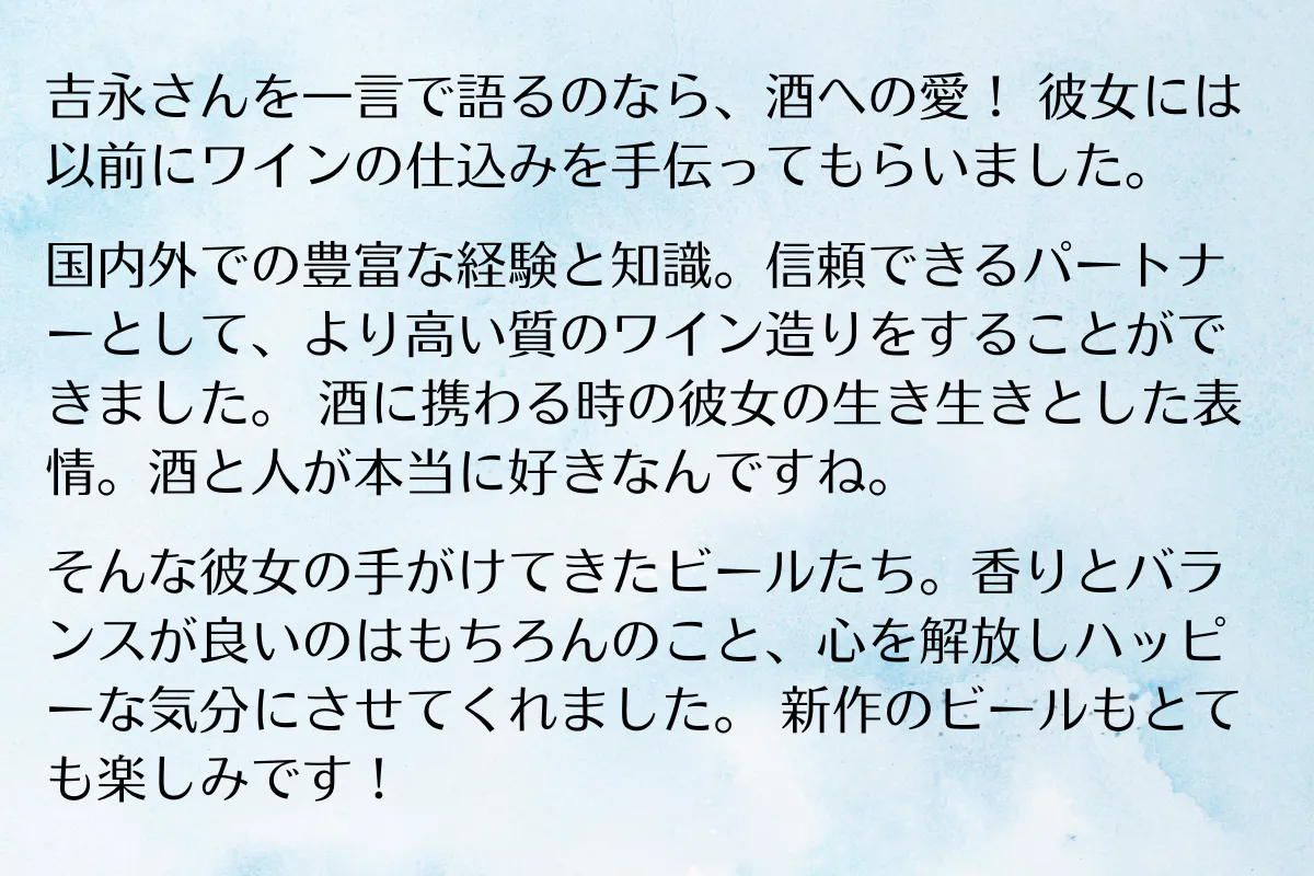阿部さんのこの一言で、ワイン、お酢からさらに日本酒醸造まで携わり、お酒の奥深さをさらに知ることになりました。今の私に辿り着いているのも、この一言があったからこそです。本当にありがとうございました!
