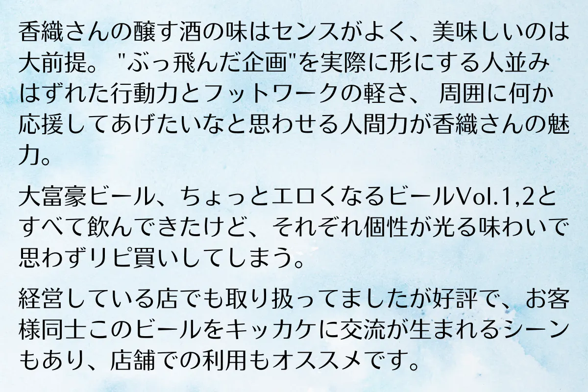 各地を転々を渡り歩いているだけの私に、ビールづくりの手を差し伸べていただき、つくりたいお酒の実現までご協力いただき、感謝とリスペクトしかない会社様です。