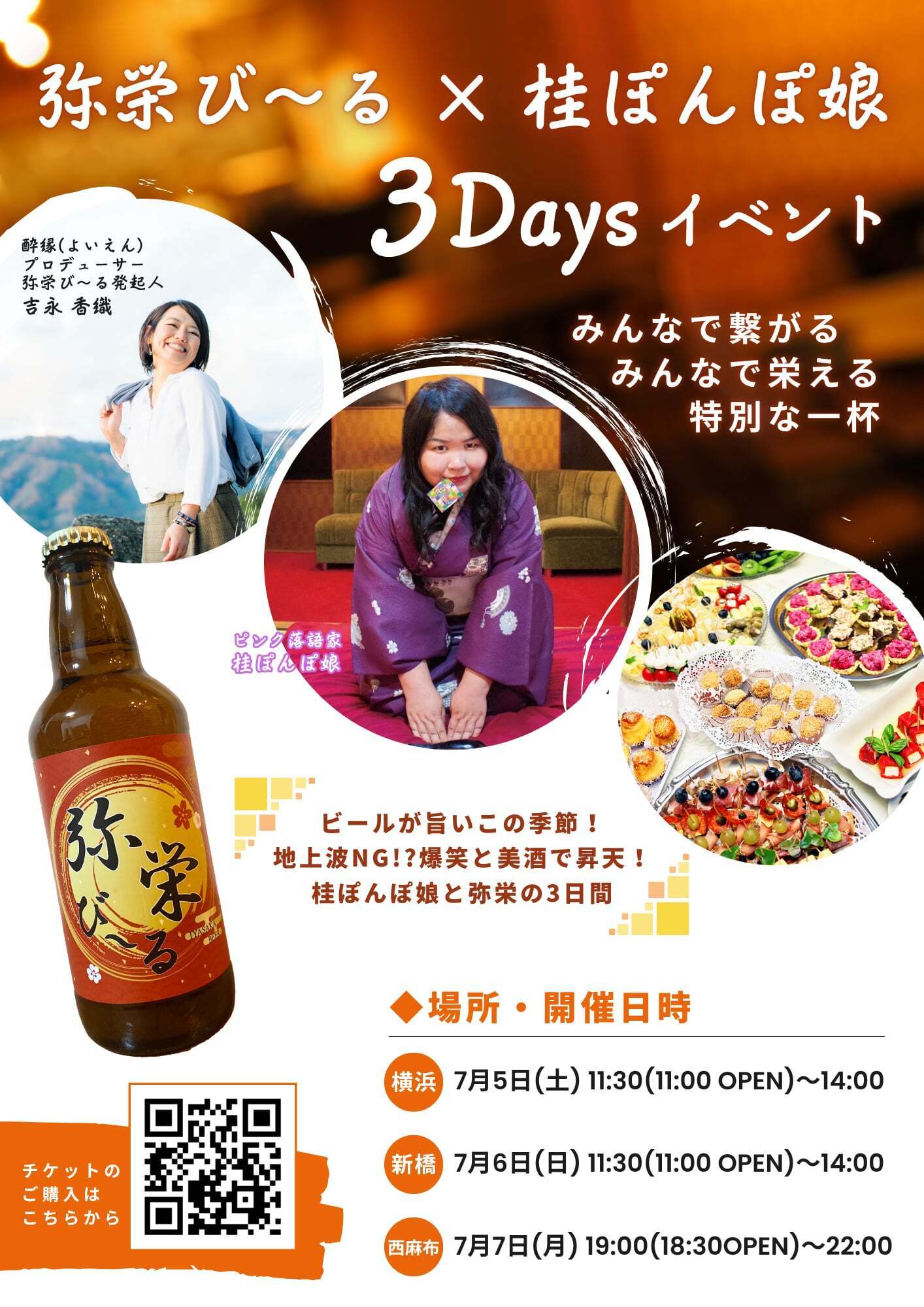 2025/06/18 13:07ご無沙汰しております!おかげさまで第4弾、の弥栄び〜るを引っ提げて、イベントを開催いたします!このイベントが出来るのも、このCampfireでのチャレンジを応援くださった皆様のおかげです。苦しい状況は続いておりますが、それでも、動くことが出来るのは幸せです。本当に、ありがとうございます。【告知】桂ぽんぽ娘 × 弥栄び〜る 3Daysイベント開催決定!\ 笑って、飲んで、また笑う。3日連続で幸せにな〜れっ!/ピンク落語のパイオニア・桂ぽんぽ娘さんと、ご縁をつなぐ乾杯ビール・弥栄び〜るが、まさかの 3日間連続コラボイベントを開催決定!!「地上波じゃ流せないけど、なぜか元気になる」「昼から飲んで、笑って、開運しちゃう」そんな大人のための贅沢な時間が、横浜・新橋・西麻布で楽しめちゃいます!お時間ある方は是非、いらしてくださいね! もっと見る