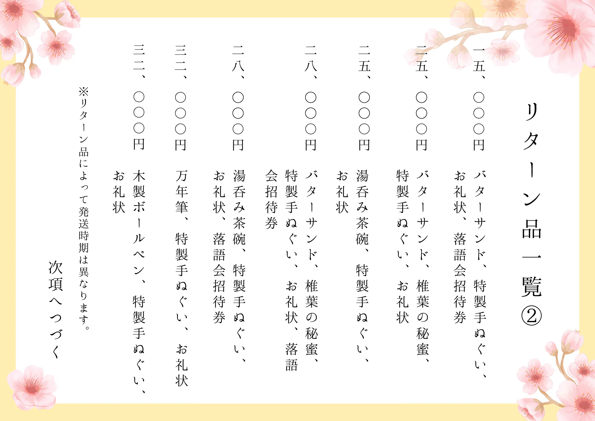 リターン品一覧は以下の通りとなっています。