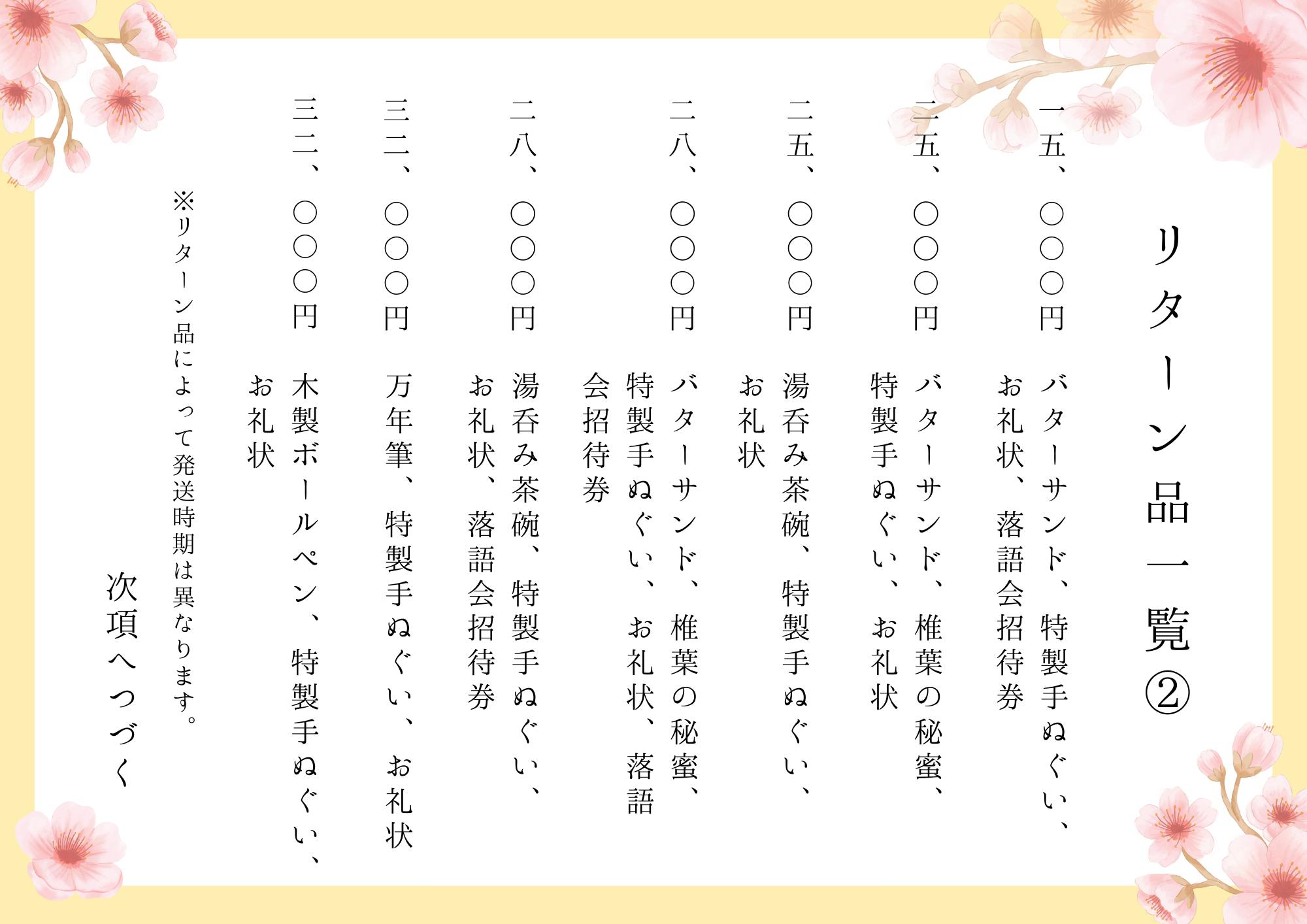 リターン品一覧は以下の通りとなっています。