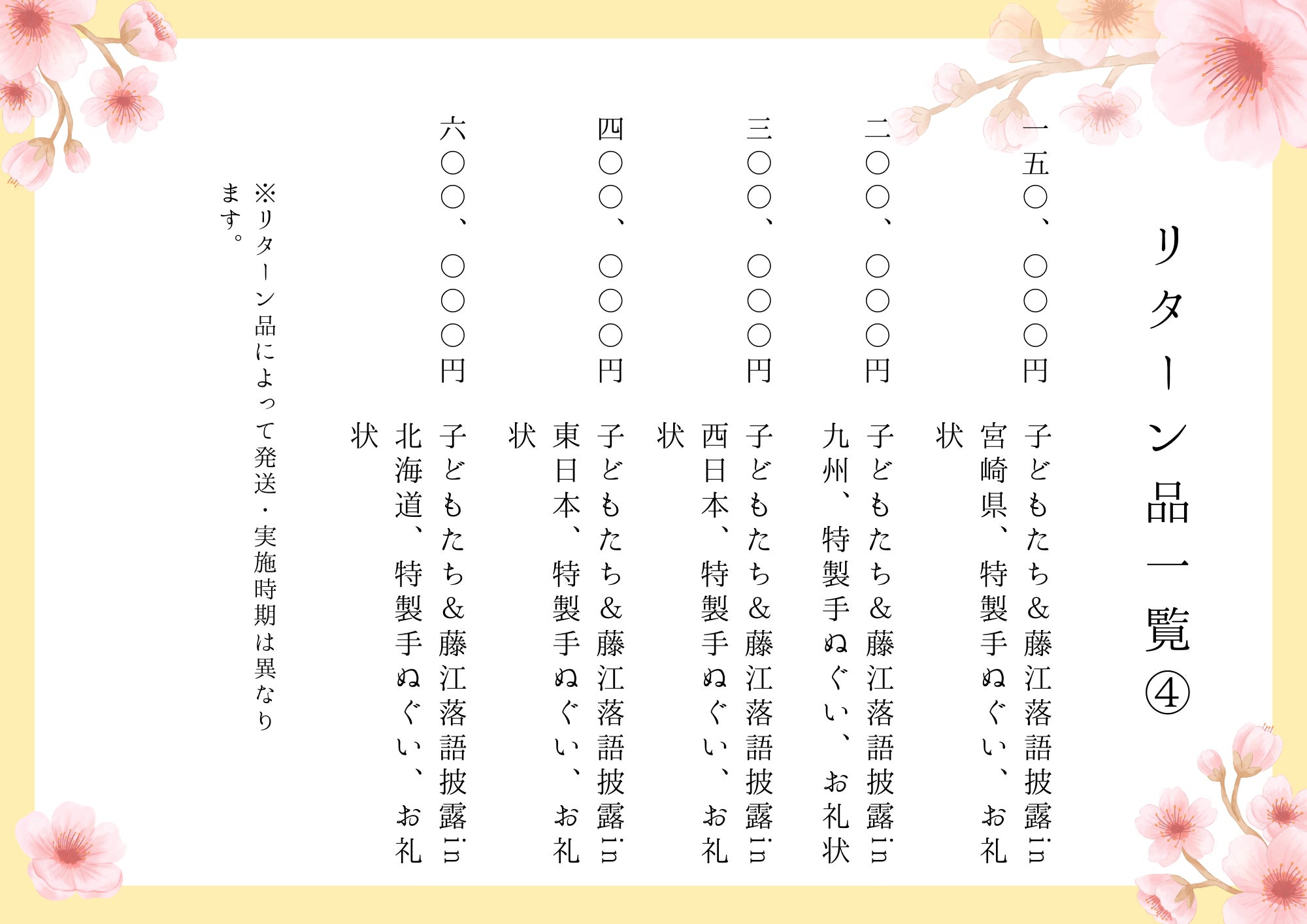 リターン品一覧は以下の通りとなっています。