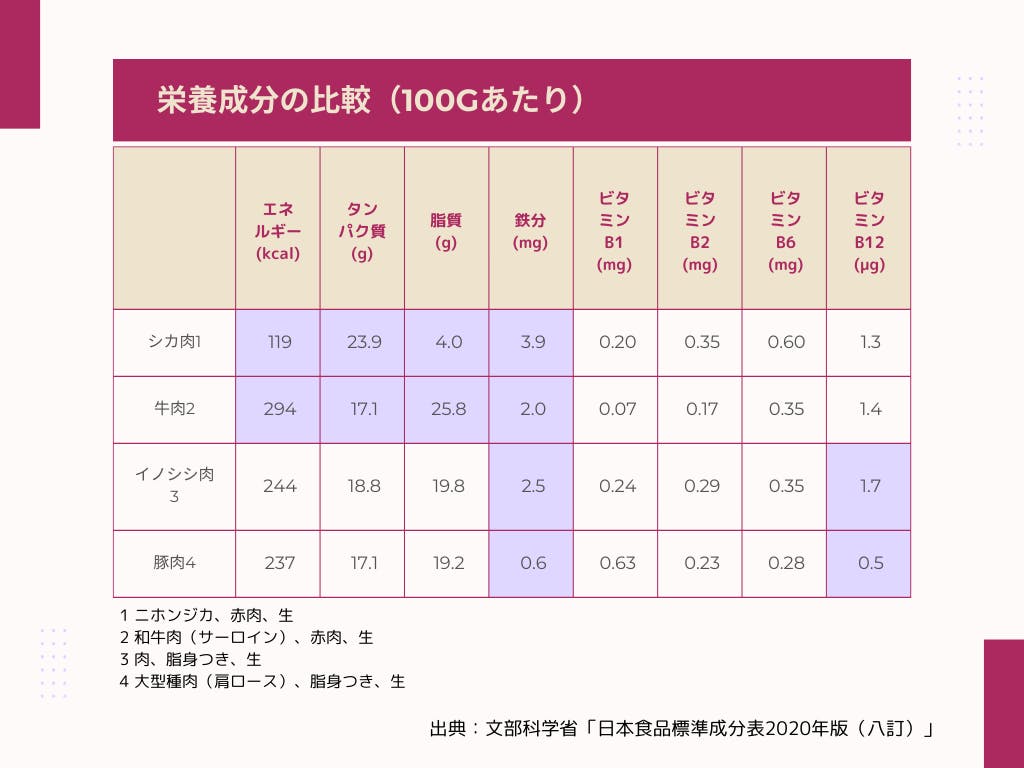 さらにジビエの魅力は、そのヘルシーさ!文部科学省「日本食品標準成分表2020年版(八訂)」 によると、鹿肉は牛肉と比べると高たんぱく質、低脂質(6分の1)でエネルギーは半分以下、牛肉の2倍の鉄分を含みます。猪肉は豚肉と比べると鉄分がおよそ4倍、ビタミンB12が3倍も含まれているのです。