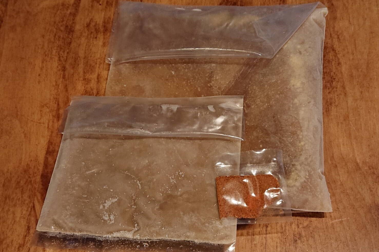 鹿のフレンチ鍋のセットをご注文いただくと、フォン・ド・シュブルイユ(大袋)、キノコのソース(中袋)、スパイス(小袋)、そして鹿肉の4点セットが冷凍で届きます。お肉は冷蔵庫で解凍していただくと、一番美味しくいただけると思います。下の方が凍っていないか、よく確認してくださいね。