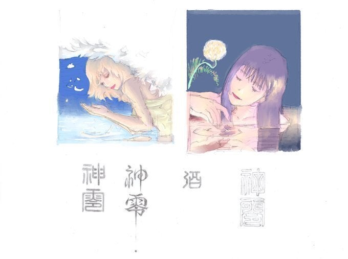カムイ先生から新しいラフ画です! イラストの持つそれぞれの日本酒のイメージ お伺いしていきたいですね! キャラクターがそれぞれ素敵で、神零の 重要人物としてカムイバースで語り継がれるでしょう