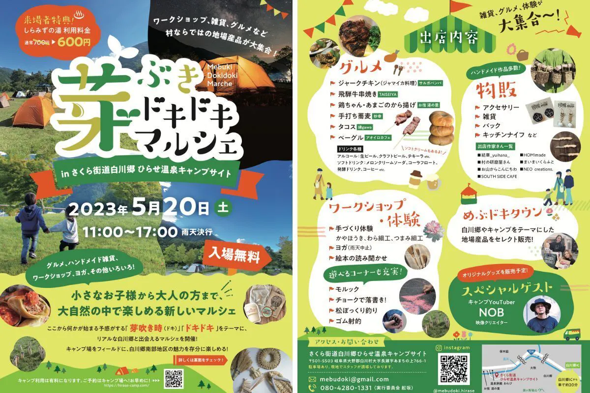 豪雪地帯の白川郷には遅い春がやってくる。やっと雪が溶け、木々が一斉に芽吹く時。木々の芽吹き時(ドキ)に、新しい出会いや魅力の発見にドキドキしたい。そんな想いを込めた、新緑のひらせキャンプサイトで南部地区のグルメ、ハンドメイド雑貨、ワークショップを楽しめるマルシェです。今年も全国の方々と一緒にドキドキを感じながら、楽しみたいです!