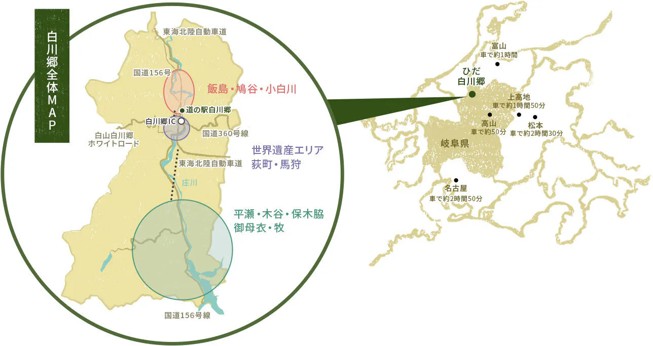 白川郷といえば、「世界遺産」「合掌集落」を思い浮かべる方がほとんどだと思います。でも実は白川郷と一言で言っても、白川郷全体が世界遺産の街という訳ではないんです。今回の舞台となるのが白川郷南に位置する南部地区です。