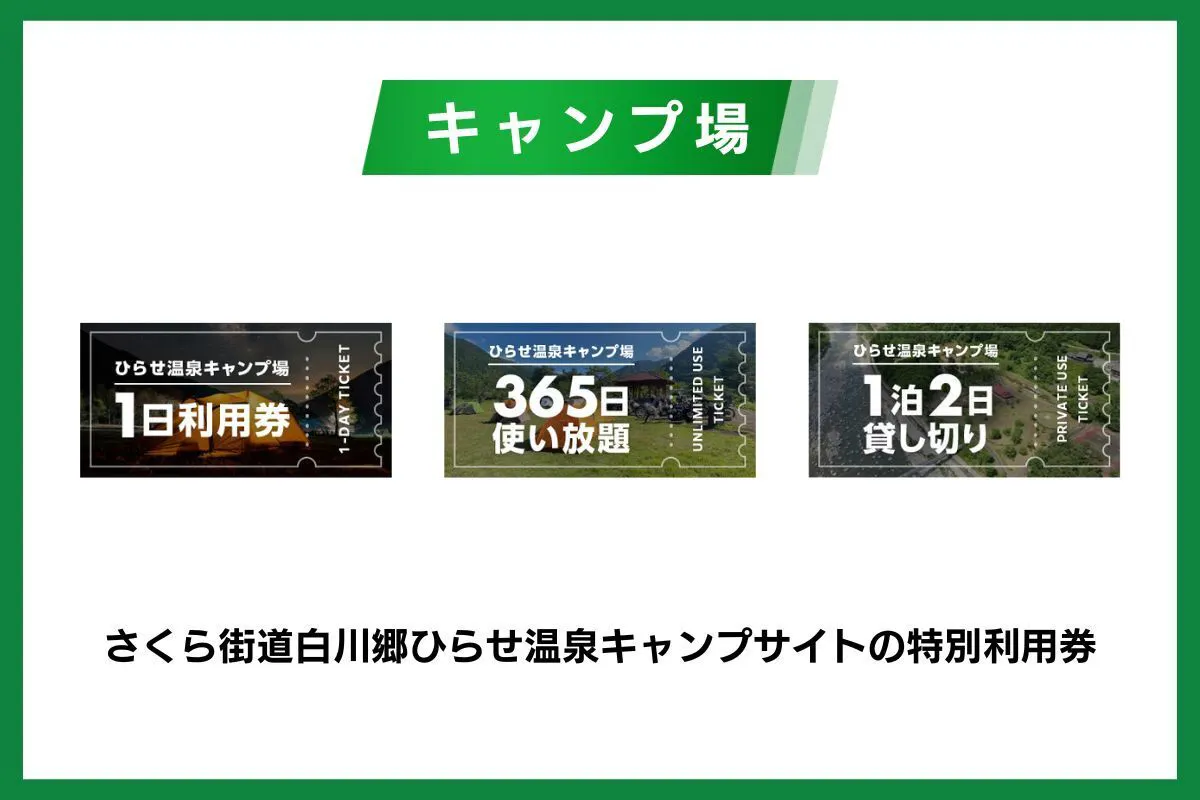100,000円:ひらせ温泉キャンプ場 365日使い放題(有効期限:1年間)