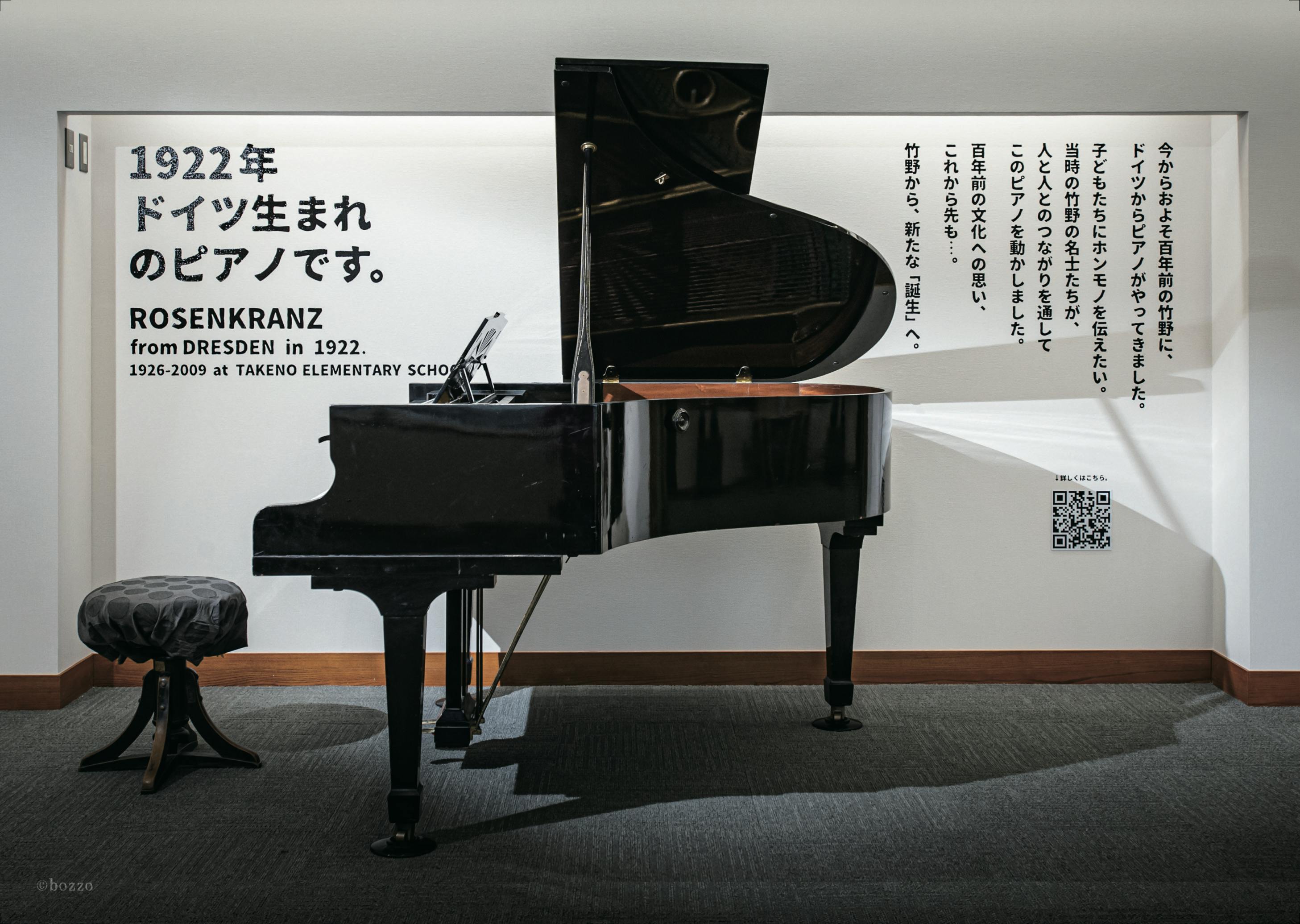 100年前に兵庫県城崎郡竹野村(現:兵庫県豊岡市竹野町)で町民の寄付を募り、ドイツからやってきたグランドピアノ。大正、昭和、平成、令和にわたって、兵庫県豊岡市の市立竹野小学校や竹野ふれあい会館で愛用されてきました。老朽化による会館の閉鎖が決まったことから、この由緒あるピアノを、奥城崎シーサイドホテルに寄贈していただくこととなりました。