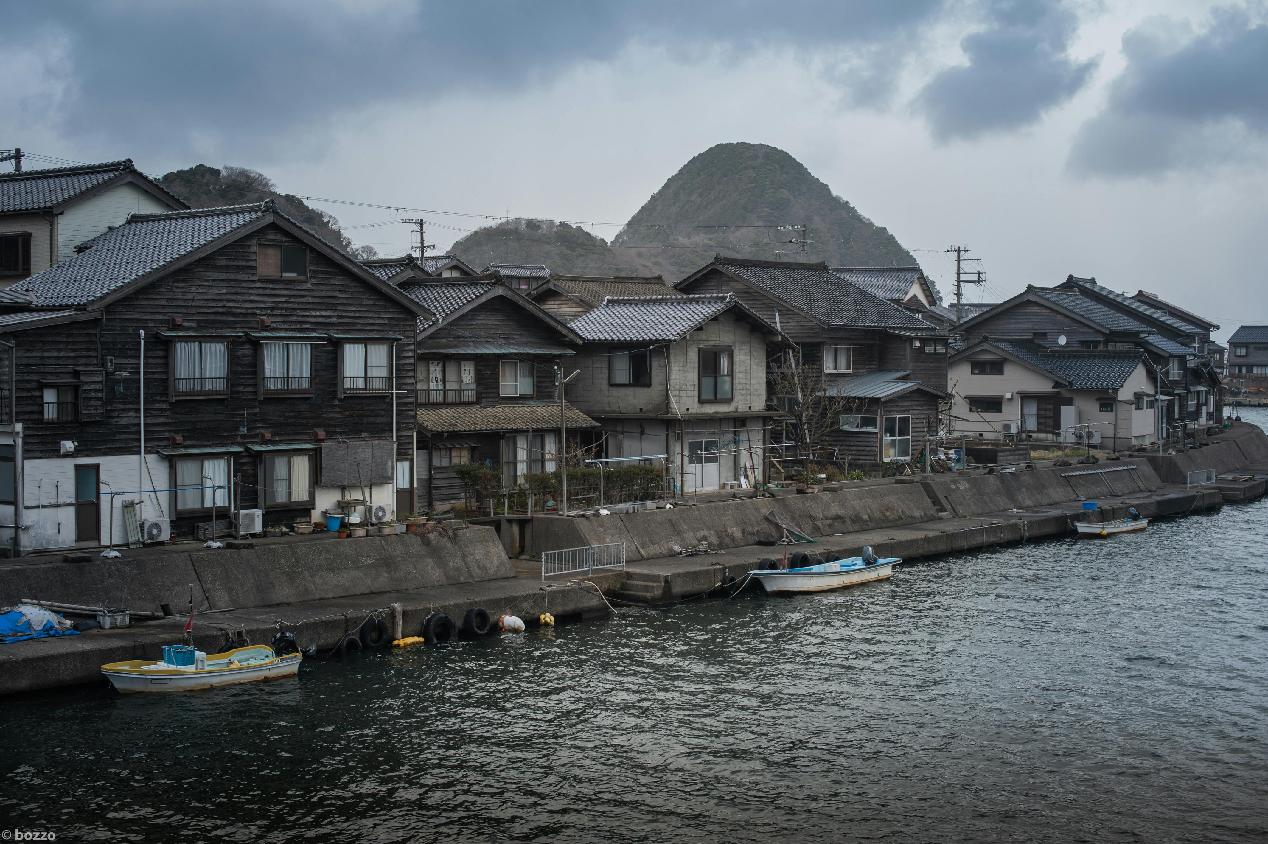 伝統的な技法「焼き杉板(やきすぎいた)」が建物の外壁に張られている、どこか懐かしさを感じる町並みです。杉板を焼き付けて表面を炭化させ、対候性と防腐性を向上させた材料で、日本海特有の強い潮風と砂から家屋を守るために使用されています。
