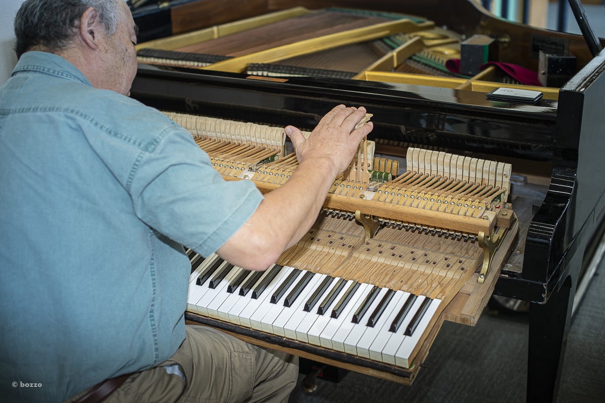 調律師の松本安生さんがオーバーホールの前段階として、状態をチェックしに来ました。