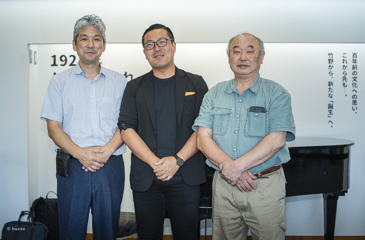 田中音友堂の田中直彦さんと岩井社長、調律師松本安生さん。