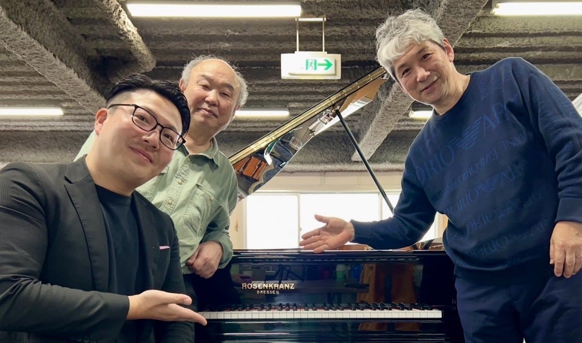 プロジェクトメンバー岩井、調律師松本安生さん、田中音友堂の田中直彦さん。