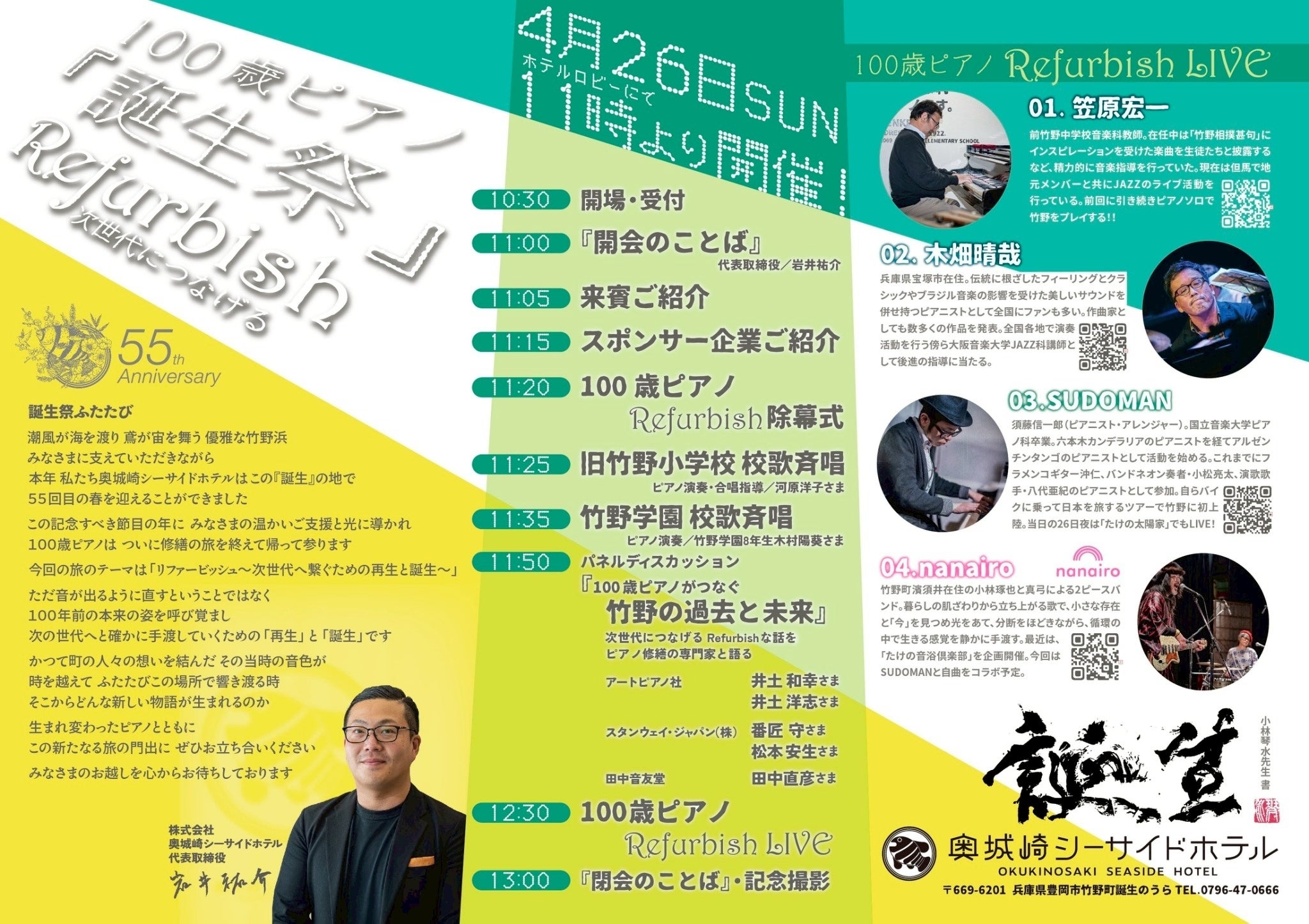 - 当日は、ピアノのお披露目(除幕式)をはじめ、修繕秘話に迫るパネルディスカッションやピアノライブなどを予定しております♪