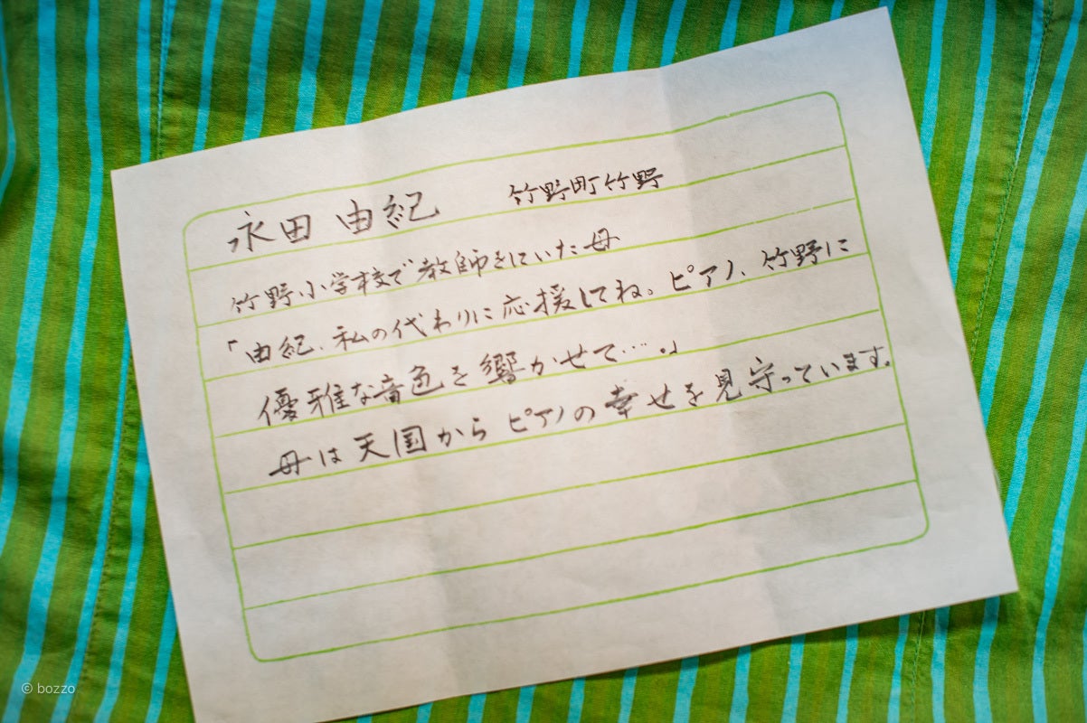こんばんわ〜【100歳ピアノ誕生プロジェクト】メンバーのbozzoです!残り11日、ネクストゴールまであと30万円!と迫ってきました!みなさんの温かいご支援、誠に誠に有難うございます!このまま11日間、駆け抜けます!竹野町は少子高齢化が進んだ日本海側の地域です。一町一川という南北に長い特異なところで、山→川→海の循環が如実に表れます。人口も4千人を割り、10年後には3千人も危うい過疎化が進んでおります。かつては3つの村だった竹野町。竹野南村、中竹野村、竹野村とそれぞれが自治を育んでおりました。各地区に小学校もあり、子どもたちもたくさん育っていたのですけど、いまは竹野浜にただひとつ。その竹野小学校も来年には中学校と併合され、『竹野学園』として9年制義務教育学校に。そうなると、『100歳ピアノ』の存在意義も薄れていくことでしょう。ドイツドレスデンからはるばる運ばれてきたピアノ。1926年から83年ものあいだ、校歌を奏でてきた小学校のピアノも、寄る辺なき存在に。だからこそ、このプロジェクトは発信されました。かつての竹野小学校から、南北に長い竹野町全体の『100歳ピアノ』へ。そんな思いを体現したような、お手紙が届きました。かつて竹野小学校で教鞭を執られていた母の思いに代わって、綴られた言葉。『由紀、私の代わりに応援してね。ピアノ、竹野に優雅な音色を響かせて…』クラウドファンディングはインターネットを媒介とするプラットフォームなので、まだまだこのような思いを持った方々に、届いていない可能性は十分あります。あと11日。なんとか、竹野町全体の思いへと拡がるよう、残りの日数、心を込めて参ります。永田由紀さん、ありがとうございました!
