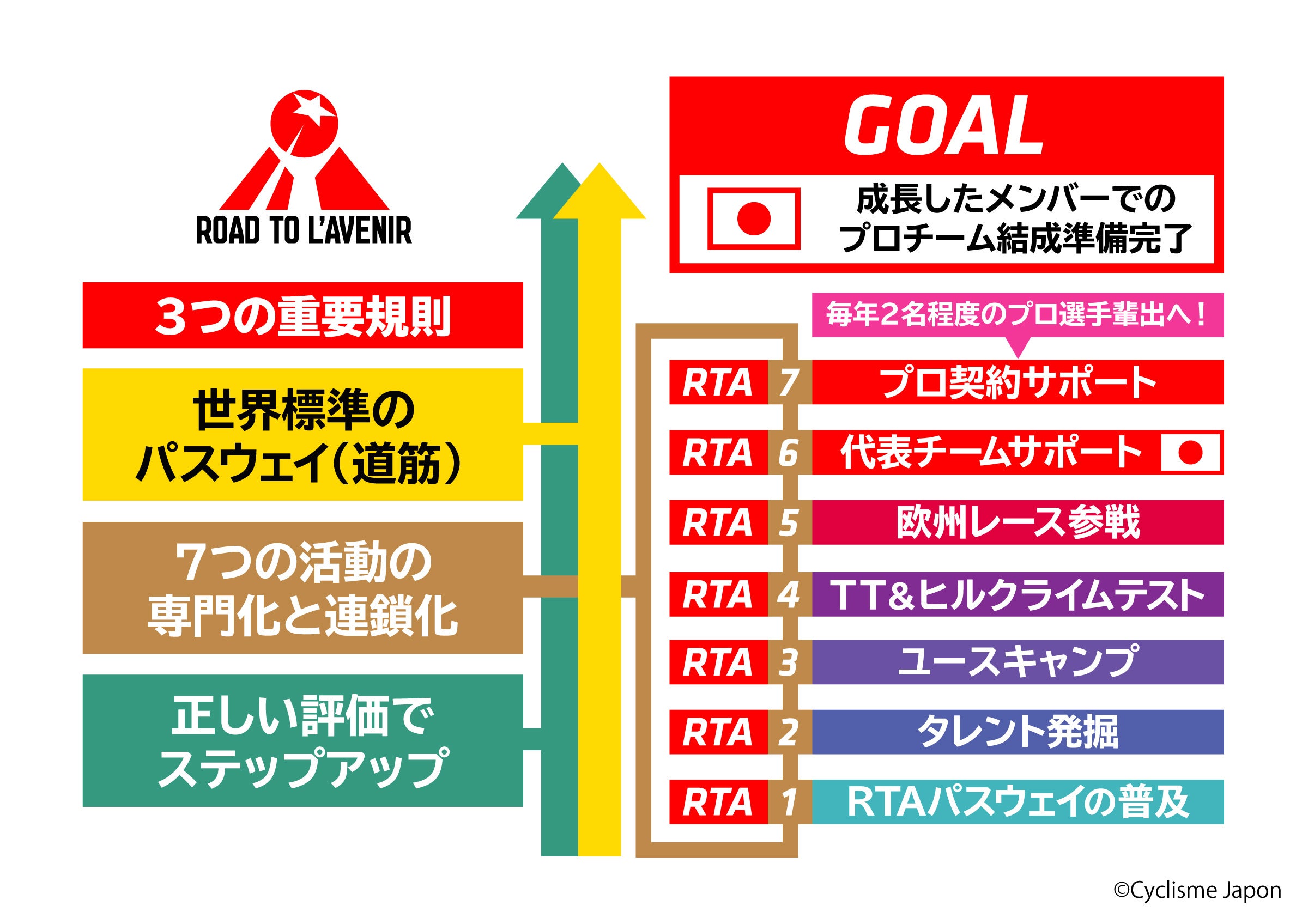 本「ロード・トゥ・ラヴニール=Road to l'Avenir (RTA)」プロジェクトは世界のプロ選手を目指すチーム・選手にとっての「世界常識」を再整理し、現在〜近未来の業界情勢に即したアプローチにて正面から地道に、かつ効率よく世界への到達を目指してゆくと言うものです。