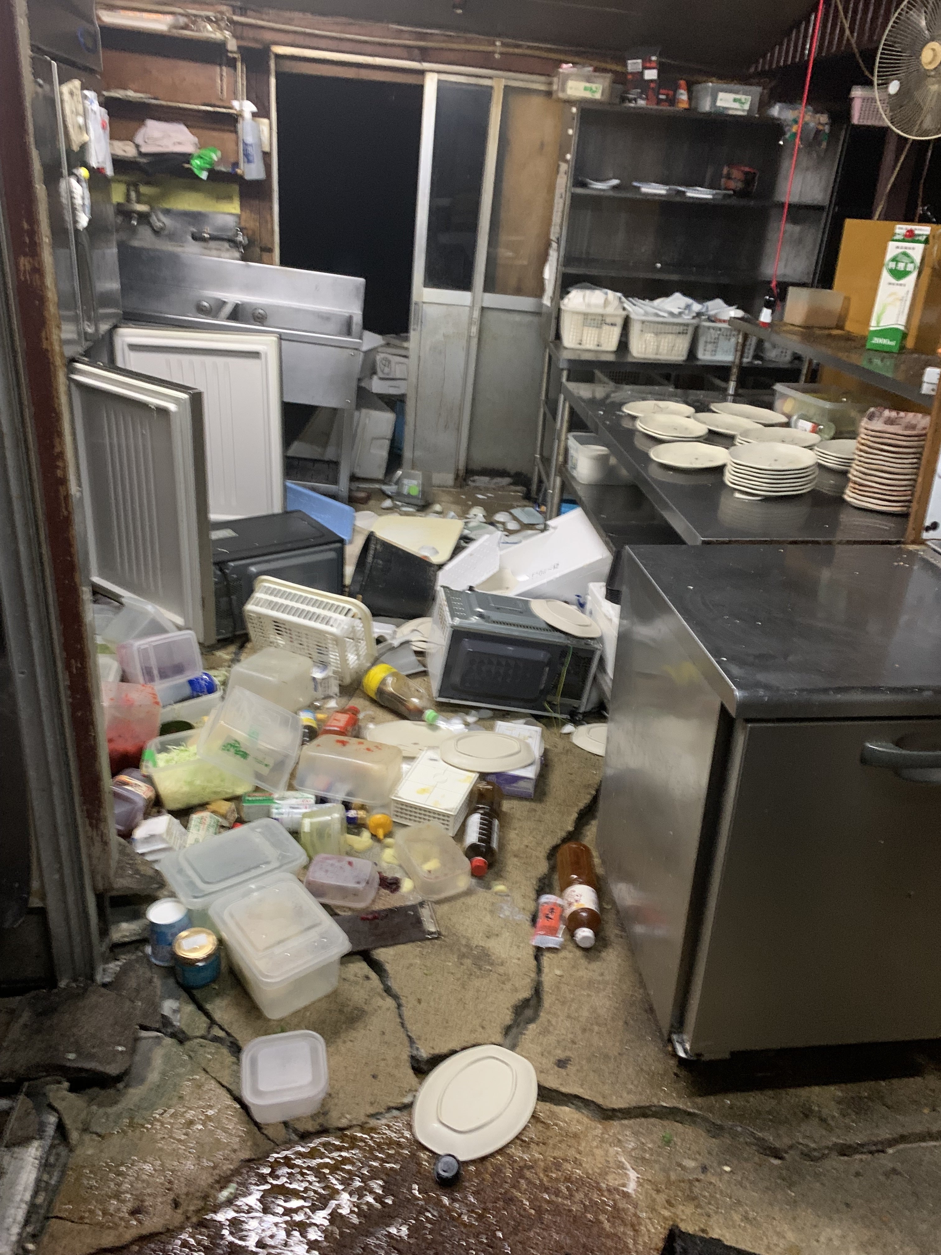 震災直後の厨房、足下には倒れたフライヤー