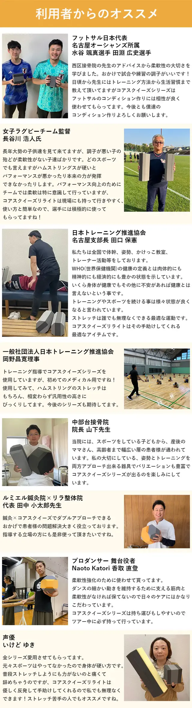 身体のトレーニングからケアまでコアスクイーズシリーズを利用いただければどこでも気軽に取り組んでいただけます!