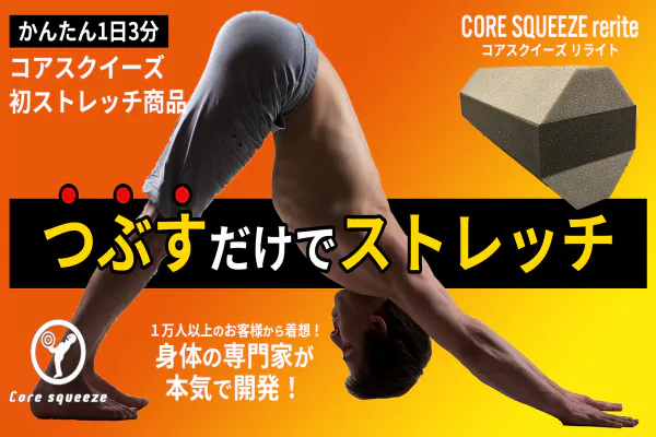 コアスクイーズリライトは、潰すだけの簡単ストレッチでハムストリングスやさまざまな部位の筋肉を伸ばすことができます!
