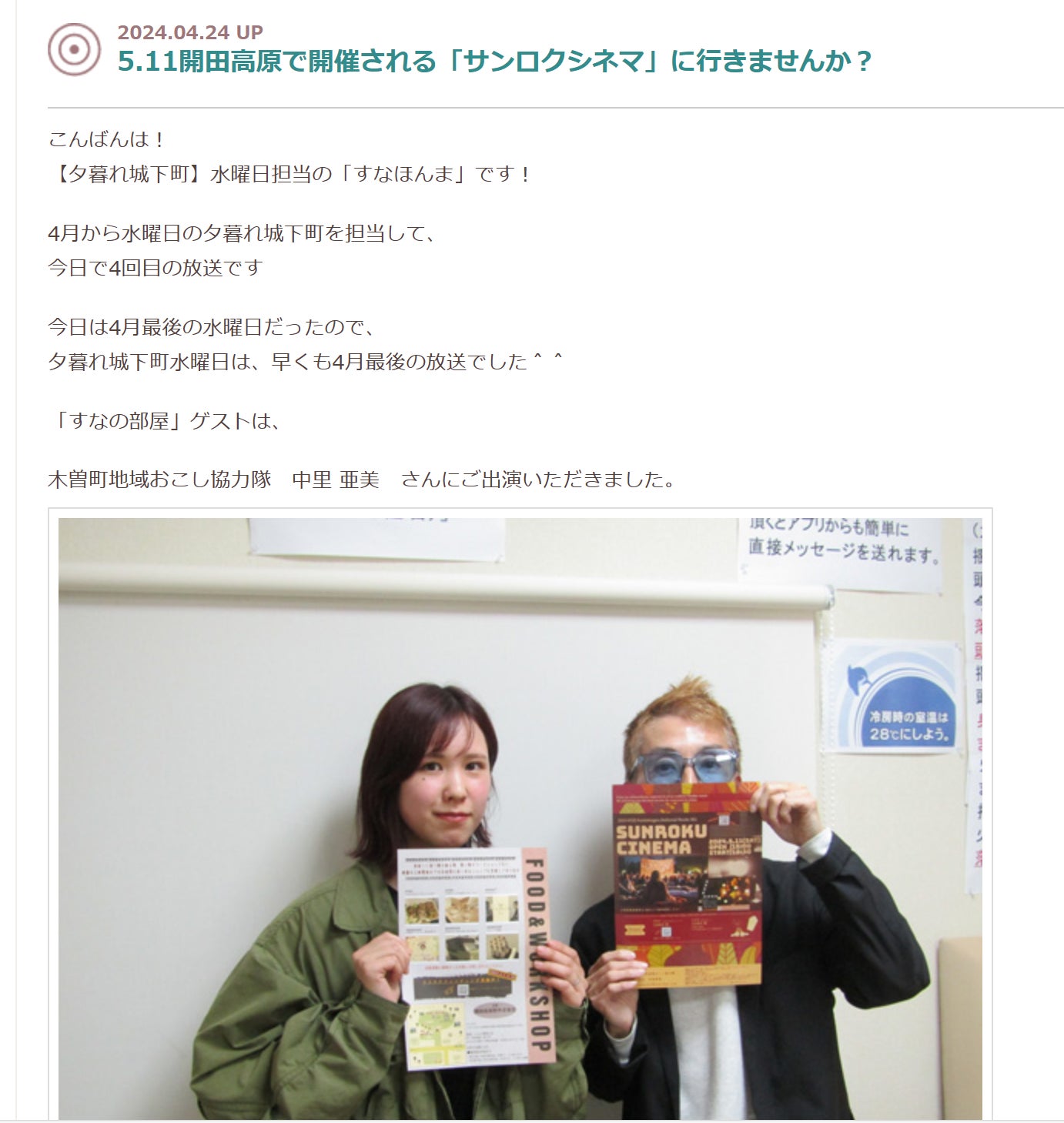 2024/04/29 12:402024年5月4日11:00~のFM長野の番組”Saturday D ”にてサンロクシネマを取材していただきます!お時間ある方はぜひチェックしてみてください! もっと見るFMまつもとに出演しました!