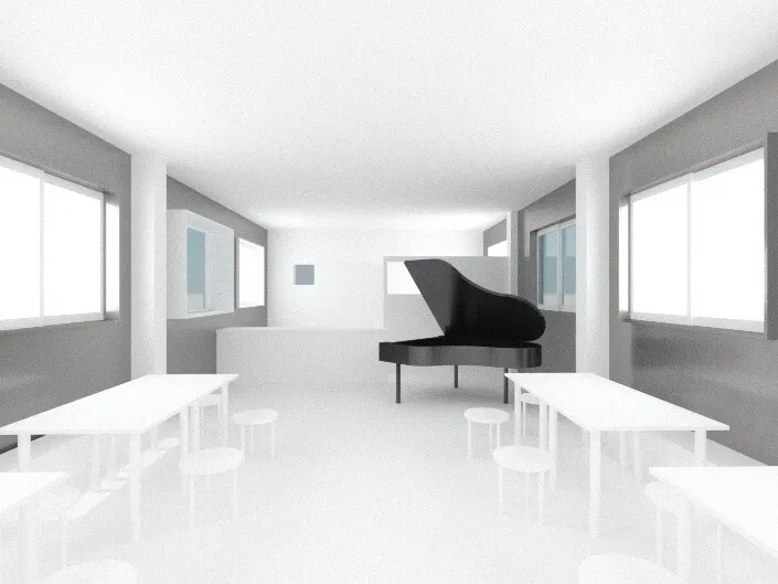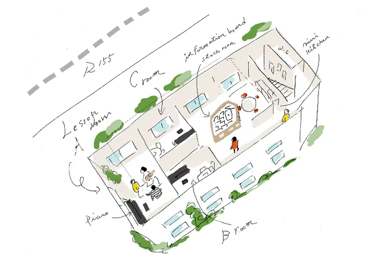 レッスンで通われる生徒さんのことを考え、できるだけ近くで、広いスペースと個室が混在し、音が思う存分に出せて駐車場も多数確保できる現在のような恵まれた物件はなく、移転先探しは困難を極めましたが、現在の店舗から約3.5km、車で10分ほどの場所に、2階建ての元福祉施設であった物件にご縁をいただきました。