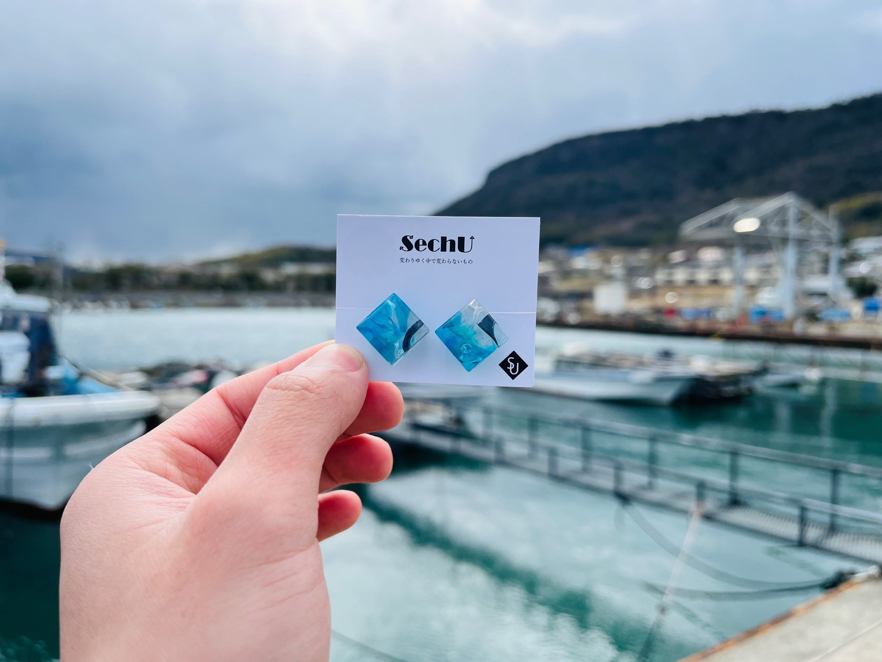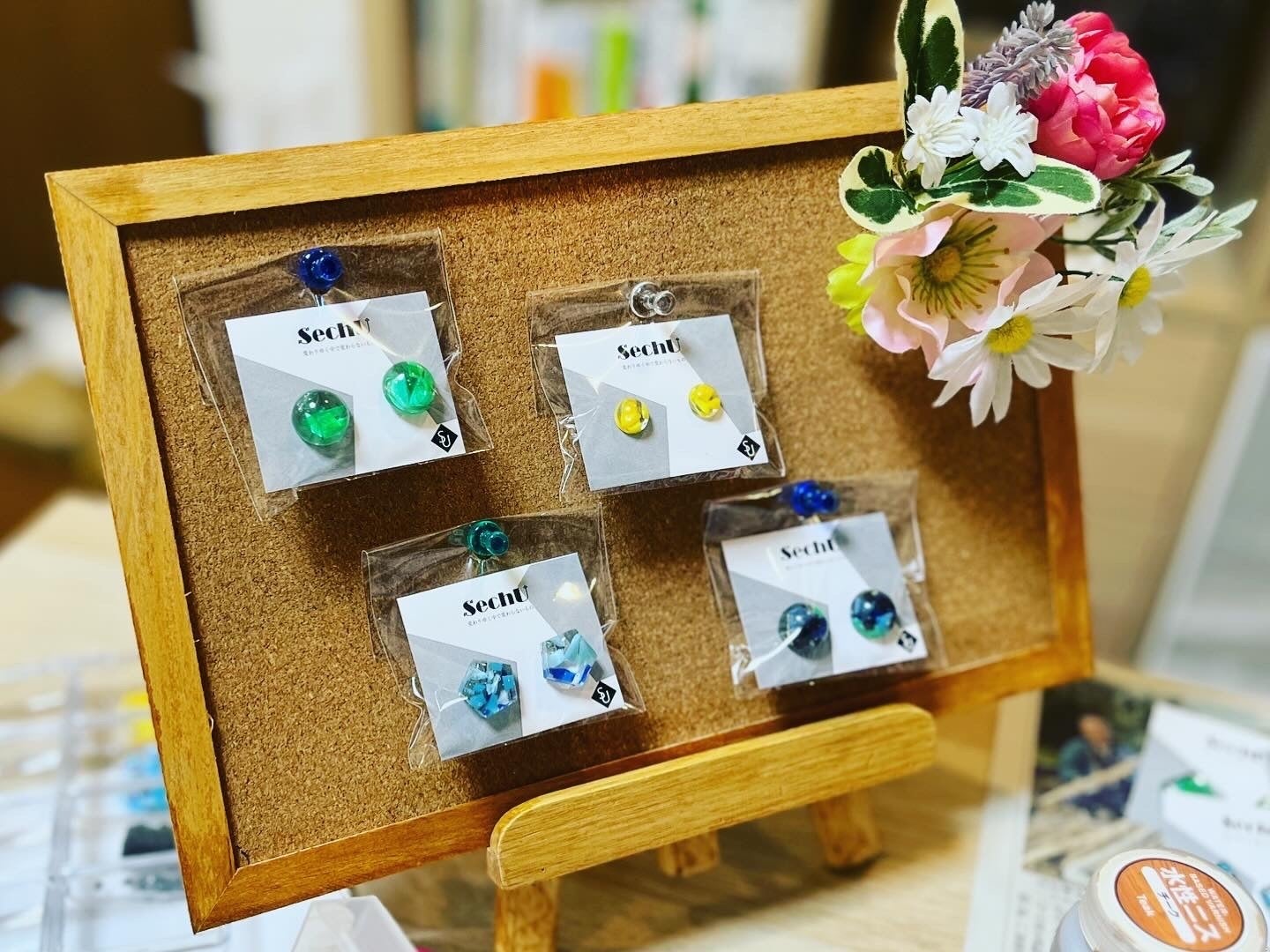 そして現在は海洋プラスチックだけでなく香川県下の企業で出る様々な廃棄物を使い、ピアスやイヤリングなどのアクセサリーを始め、ペンケースやポーチなどの生活雑貨の商品開発をしています。