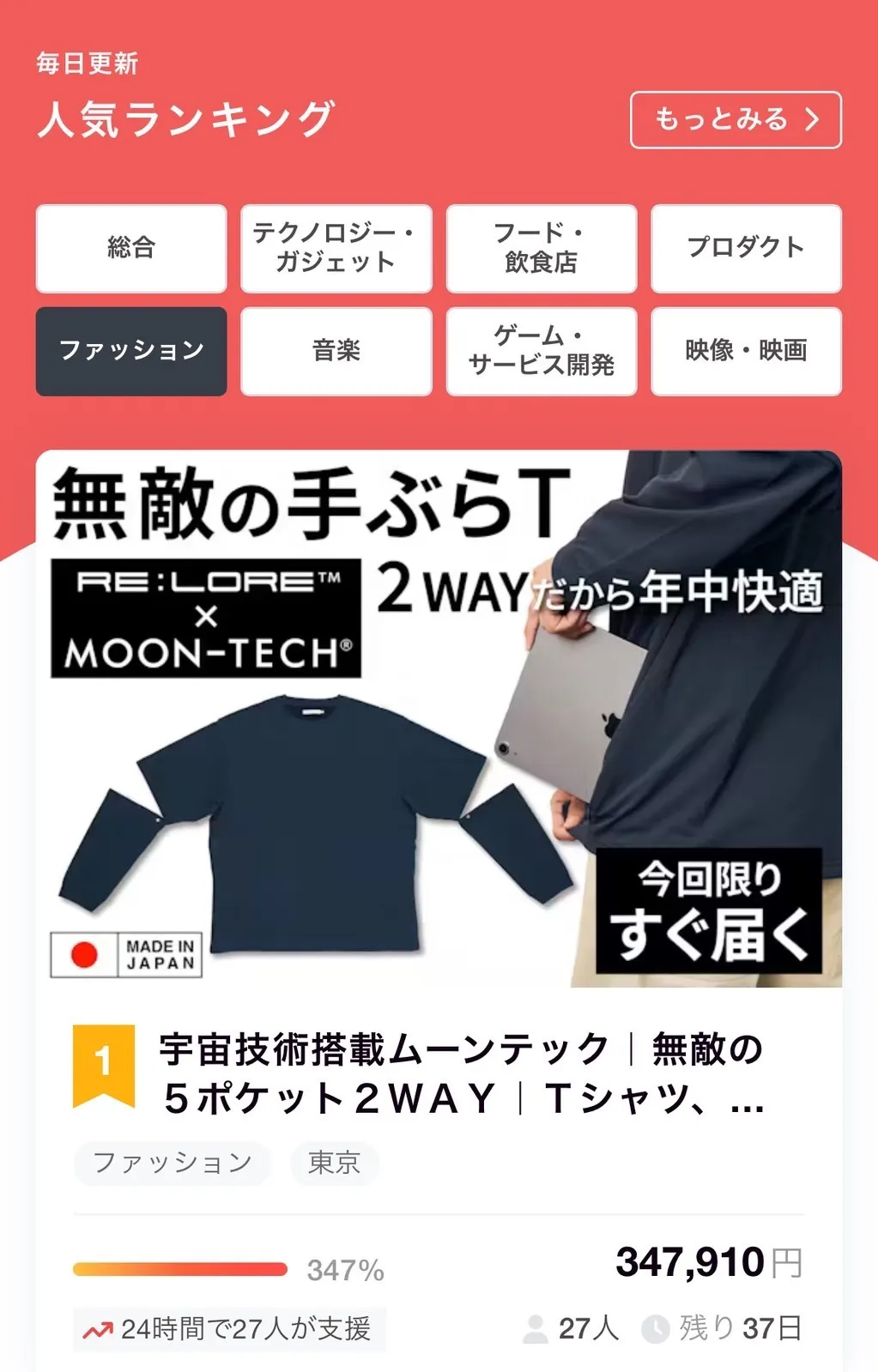 2025/08/01 16:41こんばんは。RE:LORE™ | リロアの川端です。本日11時〜MOONRAKERSさんとの初コラボアイテム『MOON-TECH® 5POCKETS 2WAY TEE』をローンチさせていただきました。おかげさまで、デイリーランキングで1位を獲得させていただきました。たくさんのご支援に深く感謝申し上げます。本当にありがとうございます。最先端テクノロジーによる過剰なほどの機能性で、未来の快適を生み出すMOON-TECH®。まさに、『無敵の機能性』です。そして、手ぶらを可能にする5ポケット、年中使える半袖と長袖の2WAY仕様など、快適性にこだわり抜いたRE:LORE™。『無敵の仕様』とMOONRAKERS代表の西田さんに命名していただきました。そして、今回『無敵の機能性×無敵の仕様』として誕生したのが『MOON-TECH® 5POCKETS 2WAY TEE』です。MOON-TECH®の通常ラインにはない、今回のコラボレーションだからこそ実現した独自の快適性を追求した一着。この一着が皆さまの生活をより快適にする一助となれば幸いです。すぐに届くリターンは残りわずかになってきております。お早めにご覧いただけますと幸いです。引き続き何卒よろしくお願いいたします。RE:LORE™ 川端 もっと見る