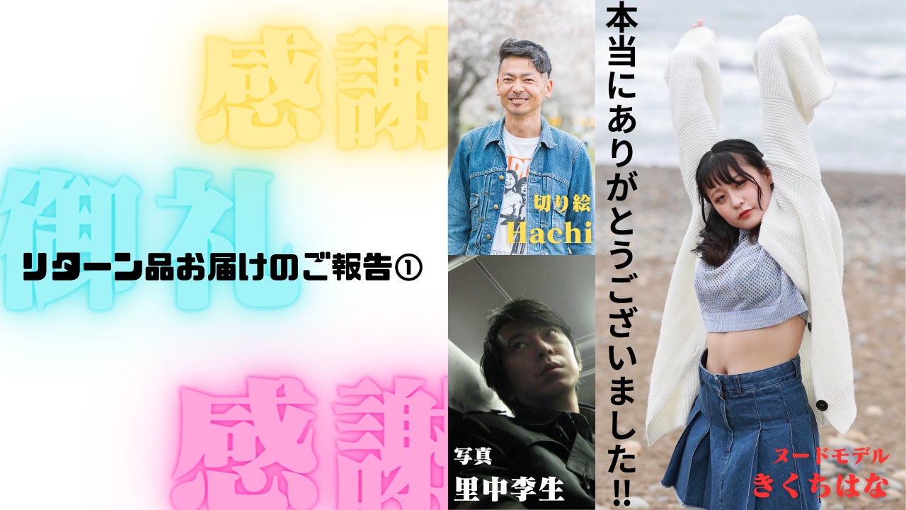 早速ですが、以下のリターン品をメールにて発送いたしました!【1,000円 切り絵アーティストHachi自伝小説】【1,000円 お礼のメッセージ送ります】【2,000円 LIVE切り絵「幸福の王子」動画】【3,000円 ~とにかく支援①~面白そうだ!里中、Hachi、がんばれ!】【5,000円 ~とにかく支援②~面白そうだ!里中、Hachi、がんばれ!】いずれもメールでの送付で完了する商品です。万が一、この活動報告をご覧になった方で「まだ届いていない」などの不備に気づいた場合、下記メールアドレスまでお知らせください。お客様のメール設定かこちらのミスにより完了していない可能性がございます。お手数ですが何卒宜しくお願い致します。切り絵アーティストHachi(八田)himeji.hachi@gmail.com以下の商品についてはお客様から写真画像の送付をお待ちしている状態です。引き続きよろしくお願いいたします【3,000円 原画ポストカードサイズ/Hachiの切り似顔絵】
