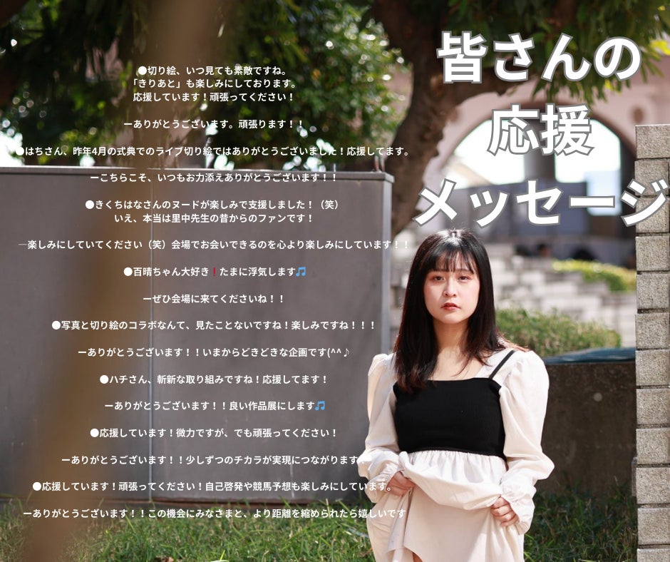 みなさんから、ご支援とともにくださるメッセージの数々・・・本当にいつも励みになります。今日はその一部をご紹介いたします!!●切り絵、いつ見ても素敵ですね。「きりあと」も楽しみにしております。応援しています!頑張ってください!ーありがとうございます。頑張ります!!●はちさん、昨年4月の式典でのライブ切り絵ではありがとうございました!応援してます。ーこちらこそ、いつもお力添えありがとうございます!!●きくちはなさんのヌードが楽しみで支援しました!(笑)いえ、本当は里中先生の昔からのファンです!―楽しみにしていてください(笑)会場でお会いできるのを心より楽しみにしています!!●百晴ちゃん大好き!たまに浮気します(^^♪ーぜひ会場に来てくださいね!!●写真と切り絵のコラボなんて、見たことないですね!楽しみですね!!!ーありがとうございます!!いまからどきどきな企画です(^^♪●ハチさん、斬新な取り組みですね!応援してます!ーありがとうございます!!良い作品展にします!●応援しています!微力ですが、でも頑張ってください!ーありがとうございます!!少しずつのチカラが実現につながります!●応援しています!頑張ってください!自己啓発や競馬予想も楽しみにしています。 ーありがとうございます!!この機会にみなさまと、より距離を縮められたら嬉しいです