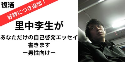 売り切れにつき、ふたたびリターン品として追加しました!好評につき追加!【あなただけの自己啓発エッセイを書きますー男性向けー】里中李生が貴方のためだけに、自己啓発・生き方のエッセイを書きます。●備考欄に「書いてほしいテーマ」「悩み」などご記入ください。※クラファン終了後でかまいません●文字数3000~5000文字●クラファン終了後2カ月以内のお届け たった3,000円で里中李生の、世界でひとつだけ、あなただけに届くエッセイが読めます!