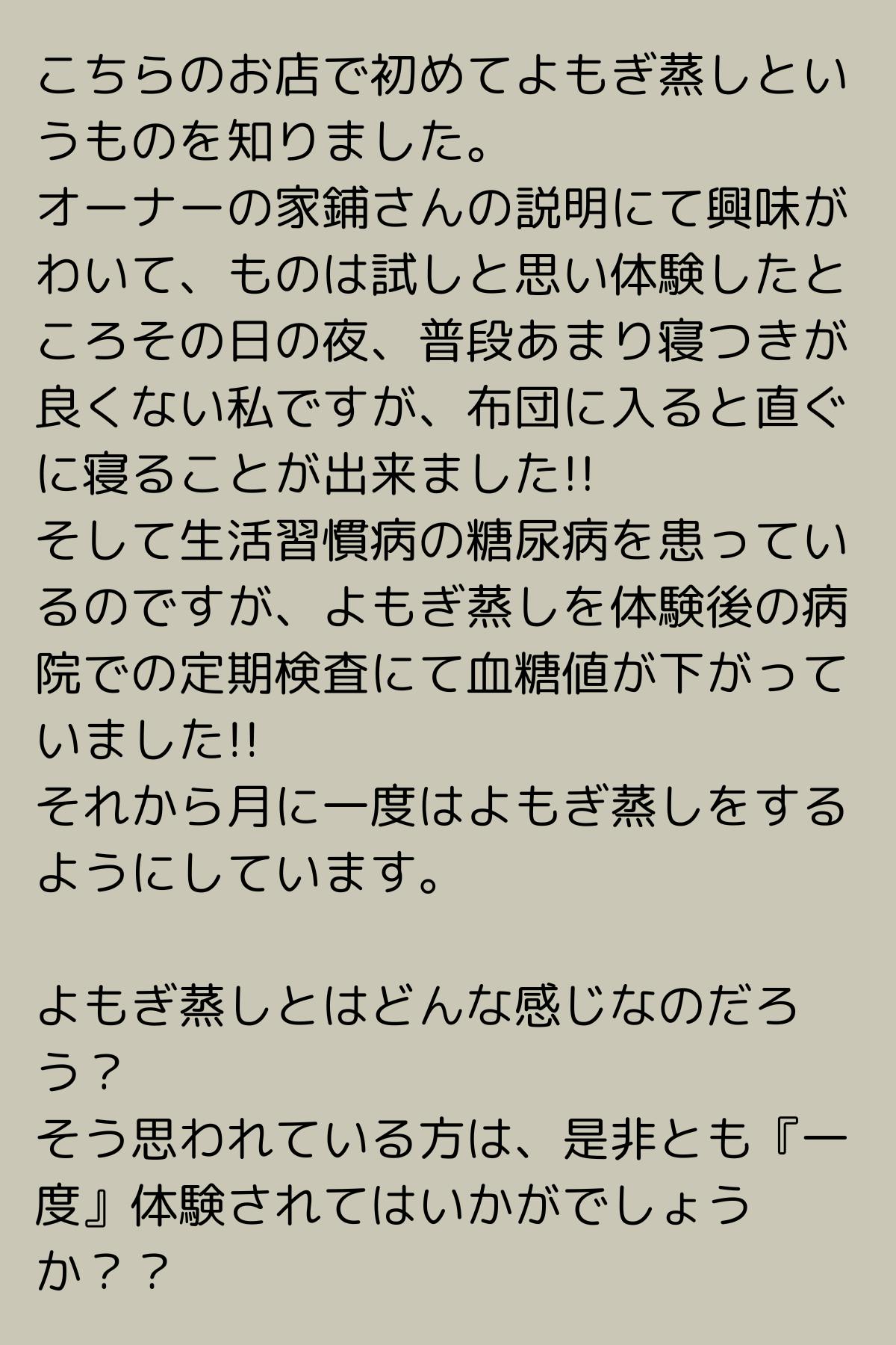 身体の元気の方を探していたのですが、よもぎ蒸しに出会い「これだ!」と思いました。