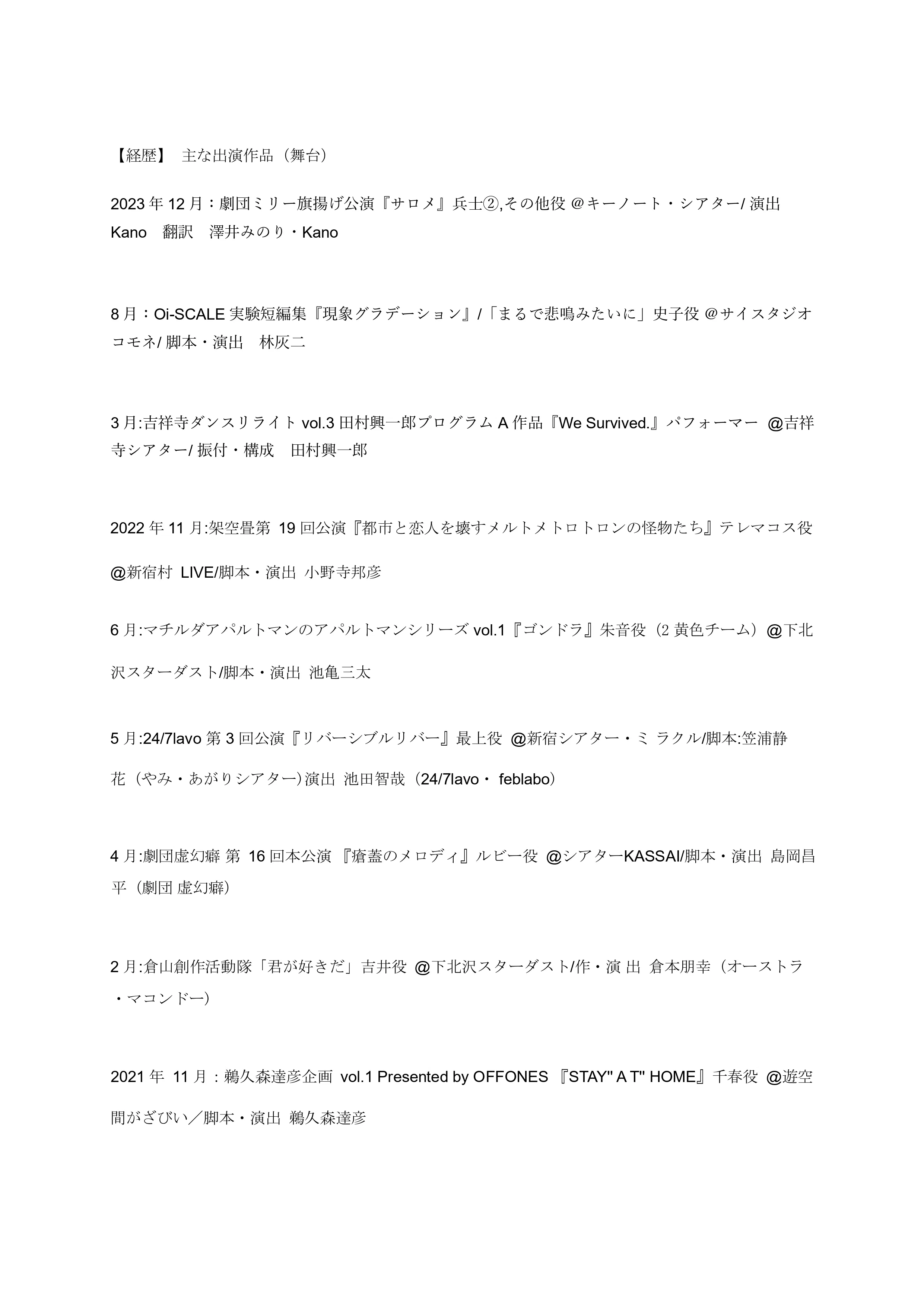監督から求められたことをすぐに吸収し、表現できる女優。しかし、自分の中でのクオリティ対する姿勢は厳しく、とことん追求する人物です。舞台の経験も多く、さまざまな役を演じることができます。詳細はプロフィールを下記に添付させていただきます。