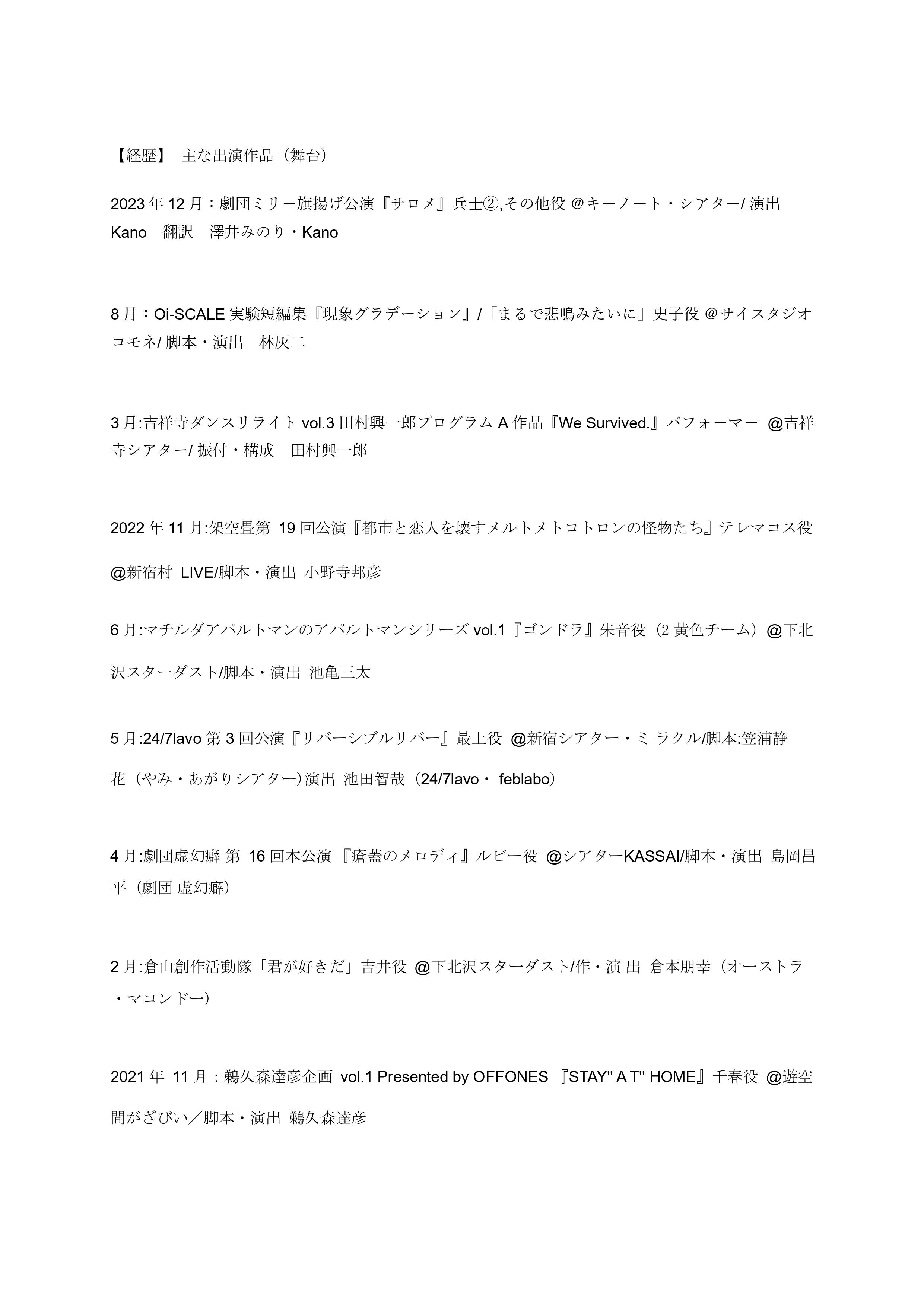 監督から求められたことをすぐに吸収し、表現できる女優。しかし、自分の中でのクオリティ対する姿勢は厳しく、とことん追求する人物です。舞台の経験も多く、さまざまな役を演じることができます。詳細はプロフィールを下記に添付させていただきます。