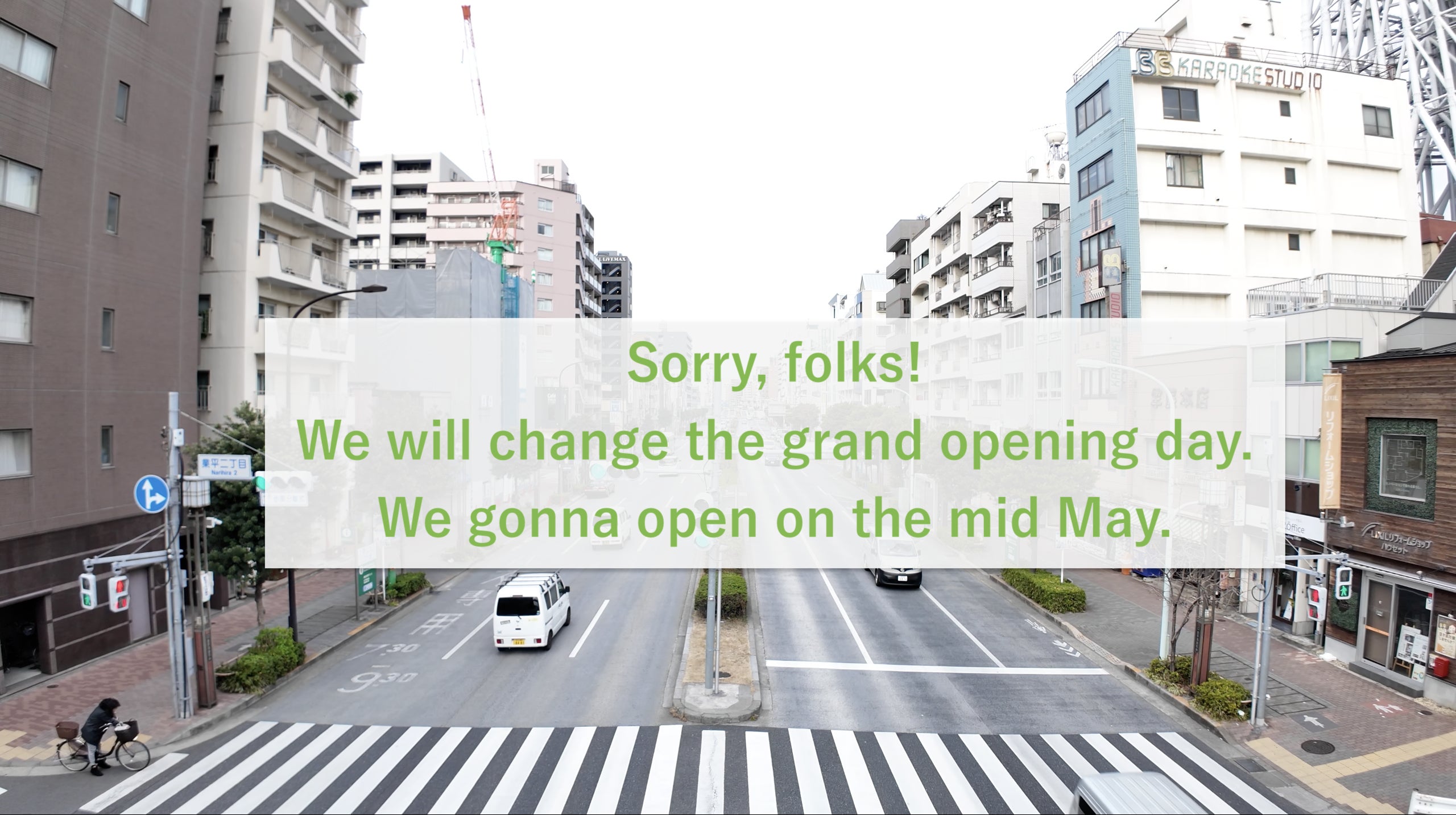 当初4月6日プレオープン、4月17日をグランドオープンとさせていただいておりましたが、3月に入り物件契約上のトラブルが発生してしまい、その解決に時間を要した結果、内装工事が遅れに遅れてしまい、オープンが1ヶ月遅れることが確定しました。