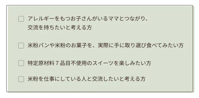 イベントでは、食物アレルギーをお持ちの方もそうでない方も楽しめる米粉スイーツや米粉パンをご用意させていただきます。アレルギーを気にせずに、食事を楽しみたいと考える方、同じような境遇にいるママさんと交流を持ちたいと考える方に、ぜひご参加いただきたいイベントです!