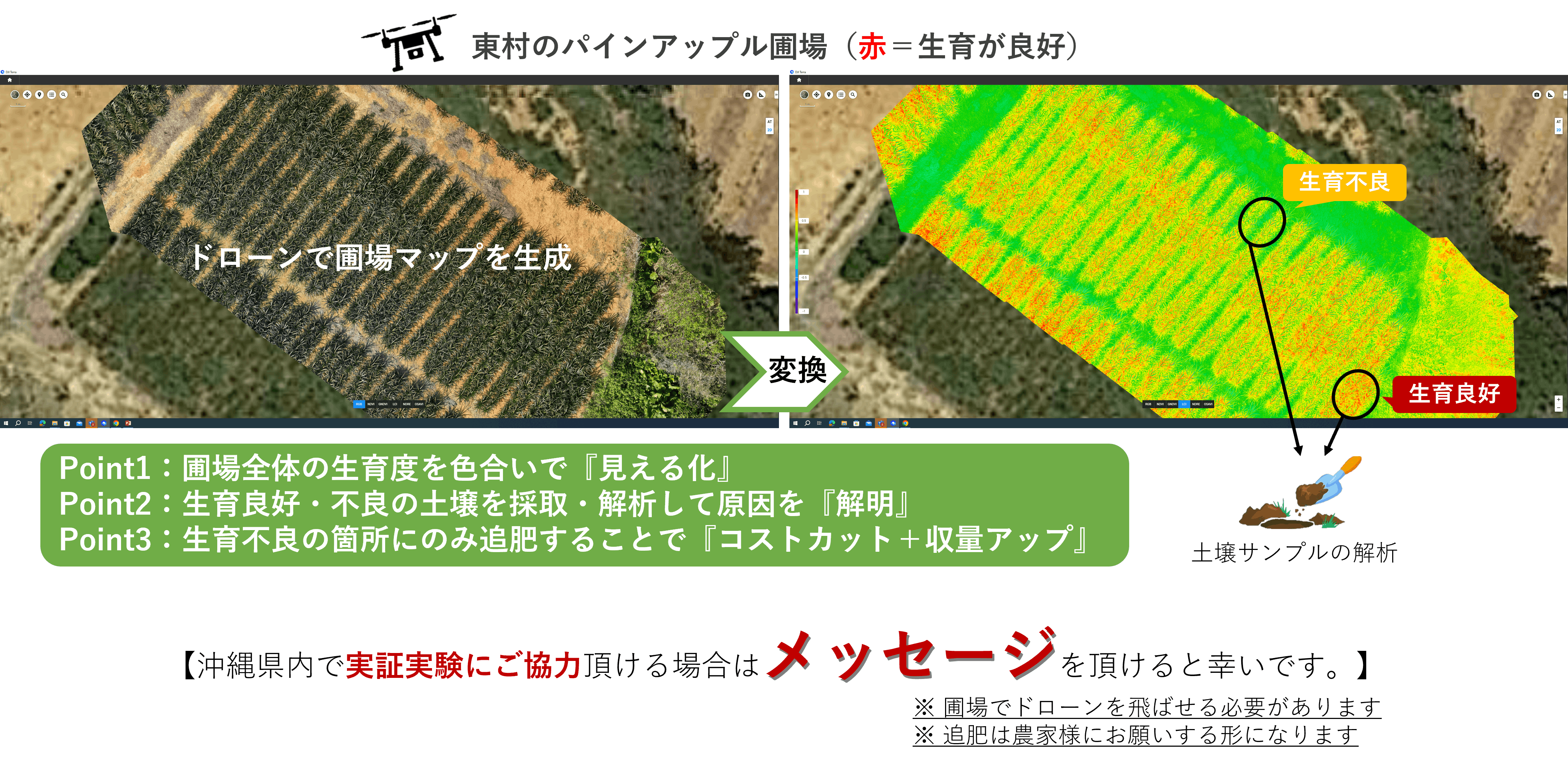 2024/03/14 21:04ミヤギ農家です。いつもご支援ありがとうございます。今回は、実証実験に協力して頂ける沖縄県内の農家さん募集のお知らせです。現在、作物の生育度を見える化して、生育が良好な箇所とそうでない箇所の土壌を化学性・生物性・物理性の観点から分析して、生育不良の原因を明らかにするための技術を開発しています。実証実験にご協力頂ける場合はメッセージを頂けると幸いです。※ 圃場でドローンを飛ばせる必要があります※ 追肥は農家様にお願いする形になります※ 有機栽培/慣行栽培は問いません※ 収量アップやコストカットを保証するものではありませんどうぞ宜しくお願いします。 もっと見る
