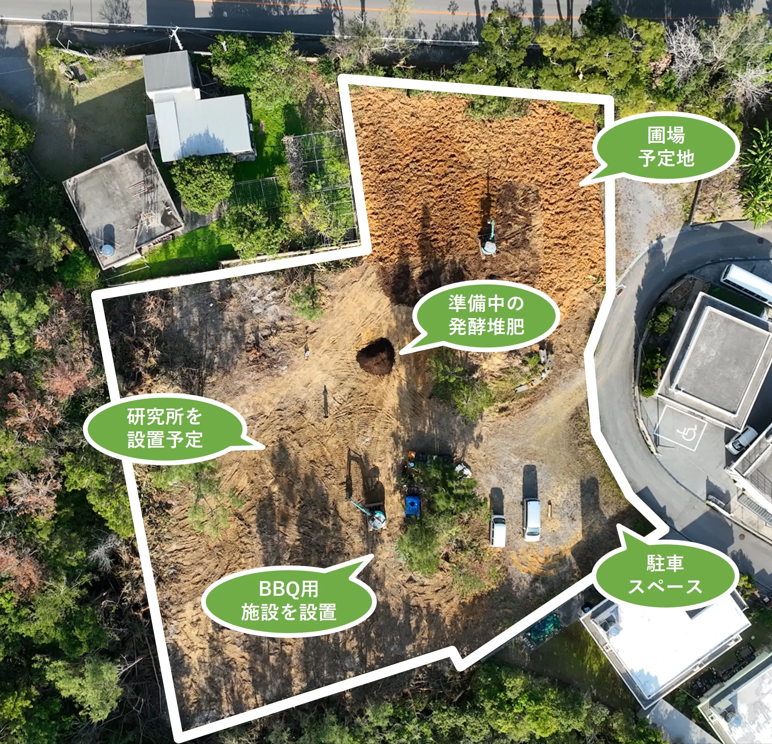 約2ヵ月で雑木林だった約900坪の敷地を整地できました!今後は、研究用のラボや雨天時でも利用できるBBQ施設(リターン用)を設置していく計画です。ただ、資金は無いので全てDIYです!そして、最新情報としては、県内の酒造メーカー様の協力も得て、圃場の害虫を駆除するための酒粕を散布して、💦