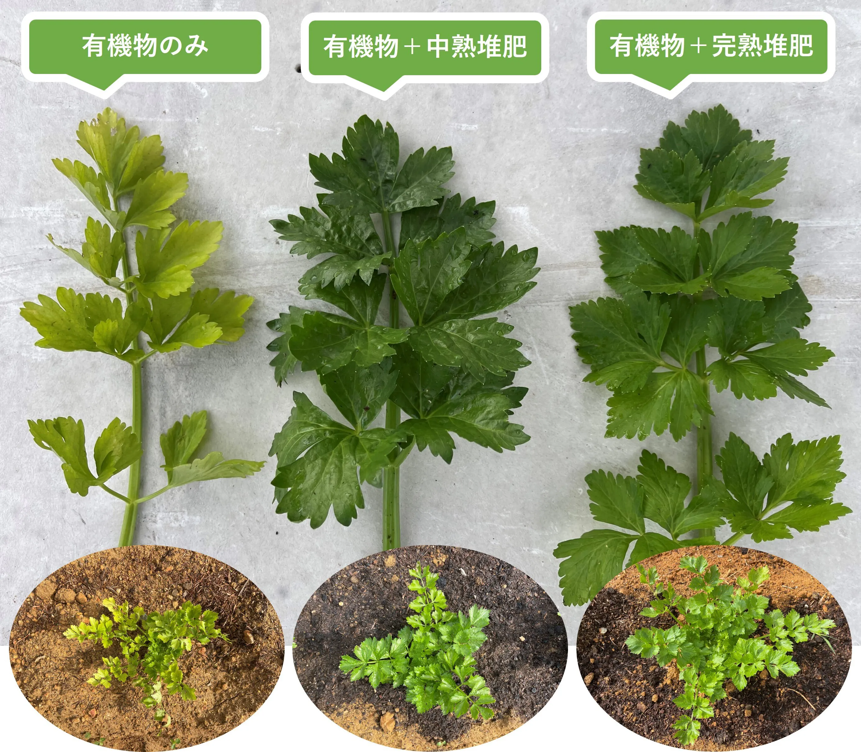 先ず生育度が違います!そして『有機物のみ散布』区は黄味がかっていて、これは栄養不足です💦『有機物+中熟堆肥散布』区はそれなりに育っていますが、緑色が濃いため、肥料(窒素)の分解が不十分だと考えられ、味に『えぐ味』が出てしまいます。一方、『有機物+完熟堆肥散布』区の場合は、私達が求めていた野菜本来の色(淡い緑)に近く『えぐ味』も少ない(はず)です!きっと栄養価も高いはずだ!って信じているので、収穫時期になったら市販のセロリとも比較してミネラルといった栄養価も評価してみます!そして、現段階で分かっている点として、改良前の土壌と比較して、
