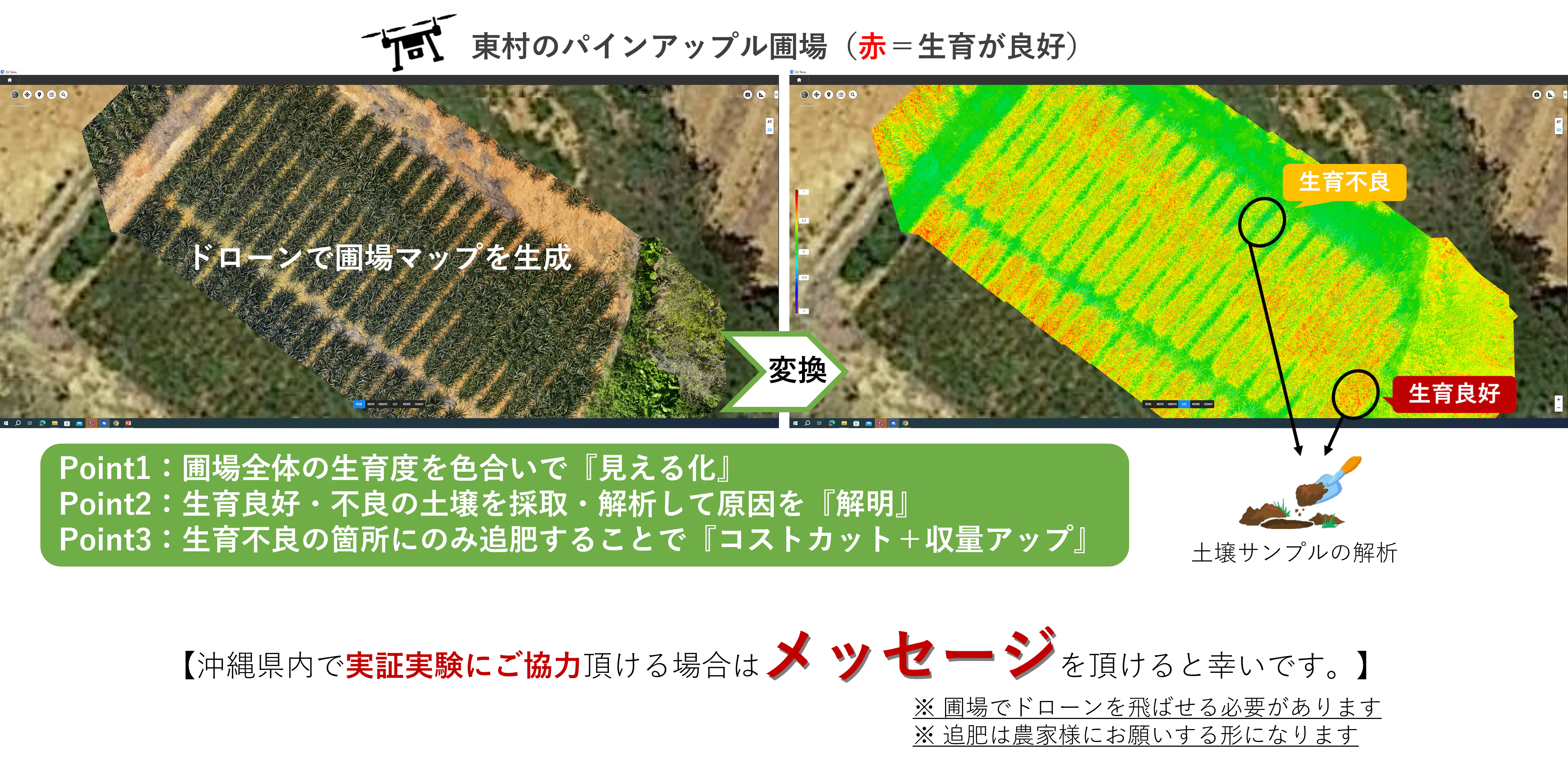 圃場の生育度を見える化して土壌診断を実施します。