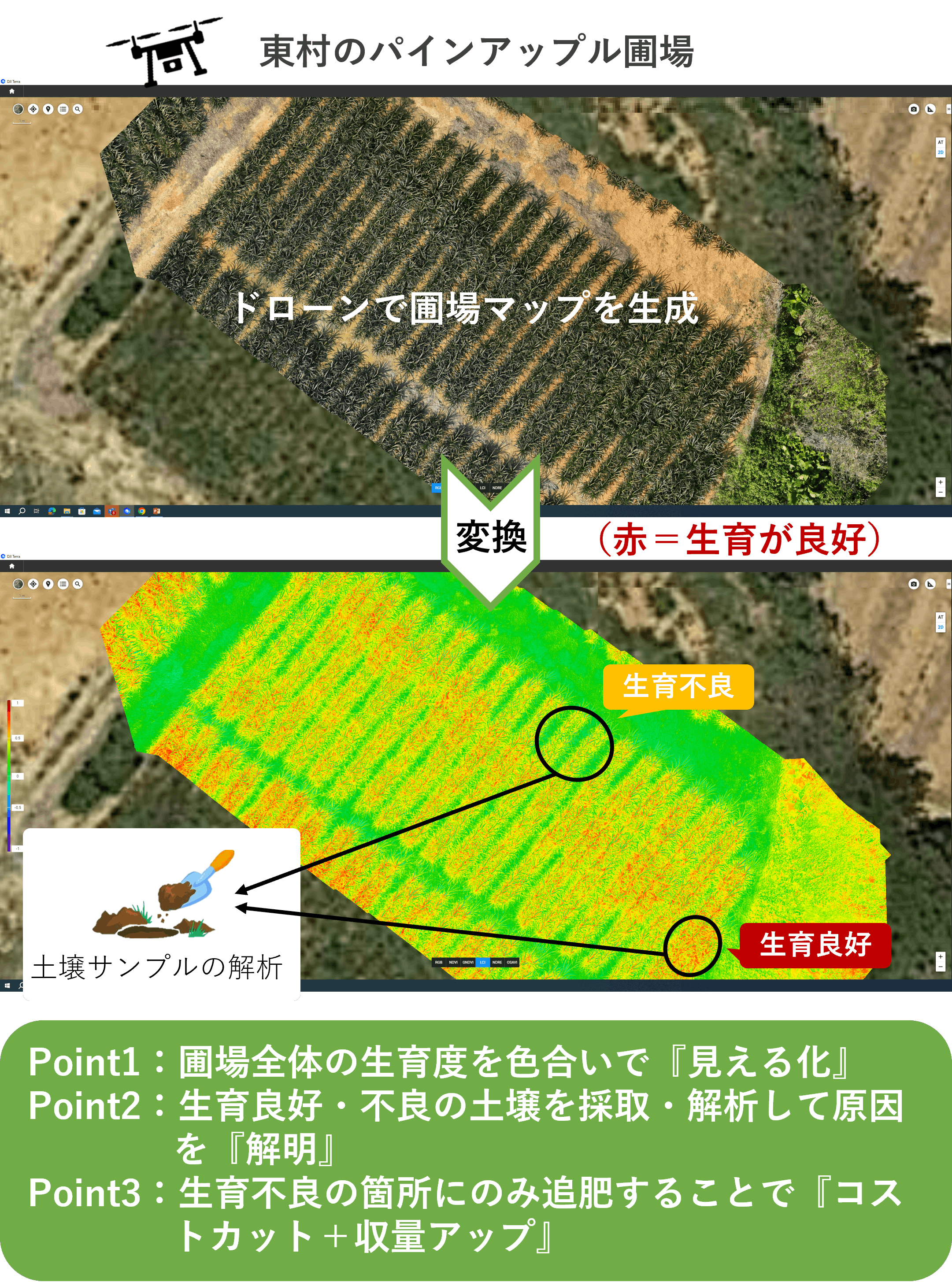する点が4つ目のPointです。AgreenTech(= AgriTech × GreenTech)とは、私達が考えた造語で、技術的な詳細については割愛しますが、AgriTech(農業×ICT)としては、圃場をドローンで撮影して植物の活性度を表すNDVI値や、物体検出AIで取得した作物の成長度合いに基づいて生育マップを生成する事で、農業の中でも特に労力のかかる生育管理を支援します。加えて、土壌(地力)の3大要素とされる生物性・物理性・化学性の中から計21項目を定量的に評価し、独自に開発したAIに学習させる事で、生育と土壌バランスの因果関係の強さを見える化します。一方、GreenTech(持続可能性×テクノロジー)としては、地域から発生する食品残渣(米糠、糖蜜、酒粕)や鶏糞、海水(沖縄の海水はミネラルが豊富)、木、微生物を活用して低コストで環境にやさしい土壌改良剤(肥料・堆肥)を開発して、土壌の団粒構造を作ります。これにより、微生物の力をフル活用して健康で栄養価の高い作物を栽培しつつ、土壌環境も回復させる環境再生型農業を目指します。また、