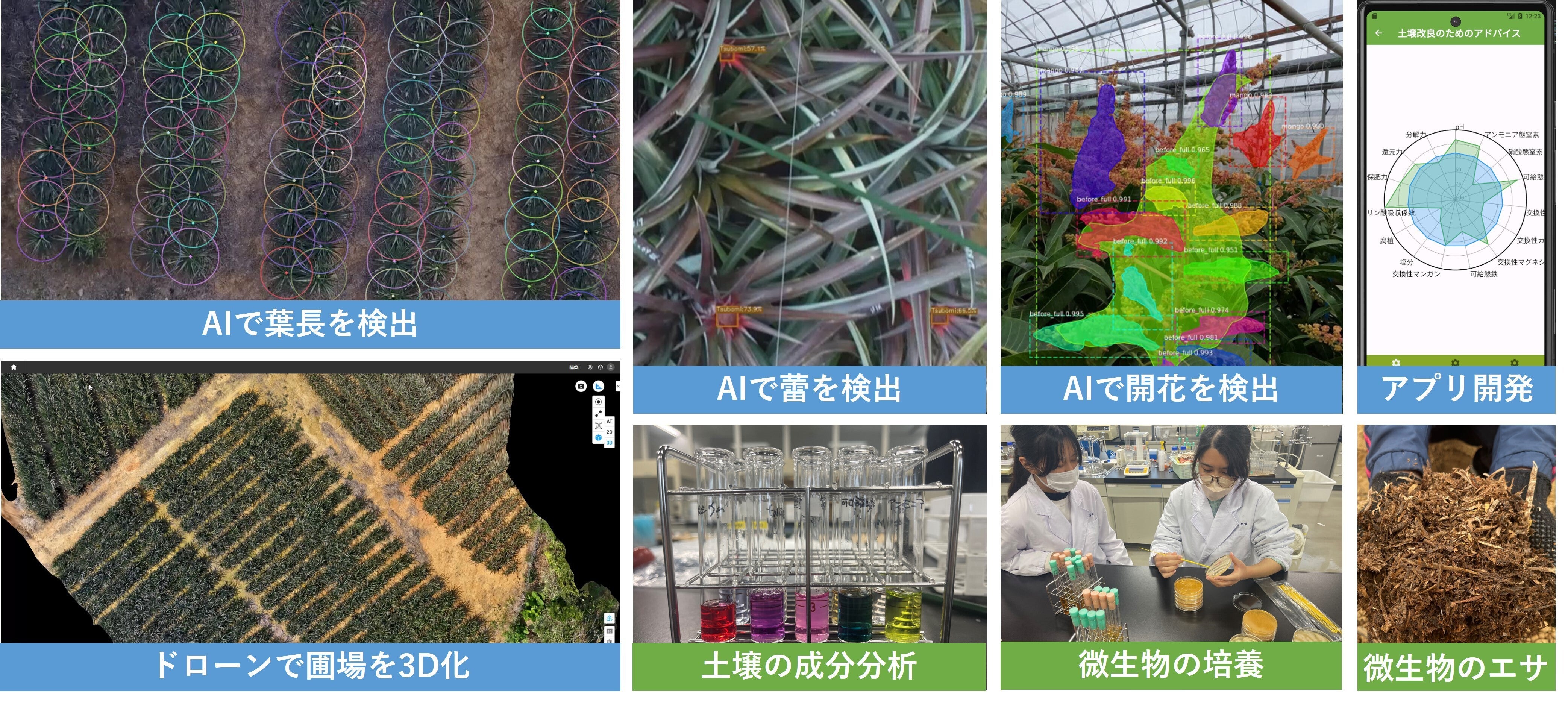 する点が4つ目のPointです。AgreenTech(= AgriTech × GreenTech)とは、私達が考えた造語で、技術的な詳細については割愛しますが、AgriTech(農業×ICT)としては、圃場をドローンで撮影して植物の活性度を表すNDVI値や、物体検出AIで取得した作物の成長度合いに基づいて生育マップを生成する事で、農業の中でも特に労力のかかる生育管理を支援します。加えて、土壌(地力)の3大要素とされる生物性・物理性・化学性の中から計21項目を定量的に評価し、独自に開発したAIに学習させる事で、生育と土壌バランスの因果関係の強さを見える化します。一方、GreenTech(持続可能性×テクノロジー)としては、地域から発生する食品残渣(米糠、糖蜜、酒粕)や鶏糞、海水(沖縄の海水はミネラルが豊富)、木、微生物を活用して低コストで環境にやさしい土壌改良剤(肥料・堆肥)を開発して、土壌の団粒構造を作ります。これにより、微生物の力をフル活用して健康で栄養価の高い作物を栽培しつつ、土壌環境も回復させる環境再生型農業を目指します。また、