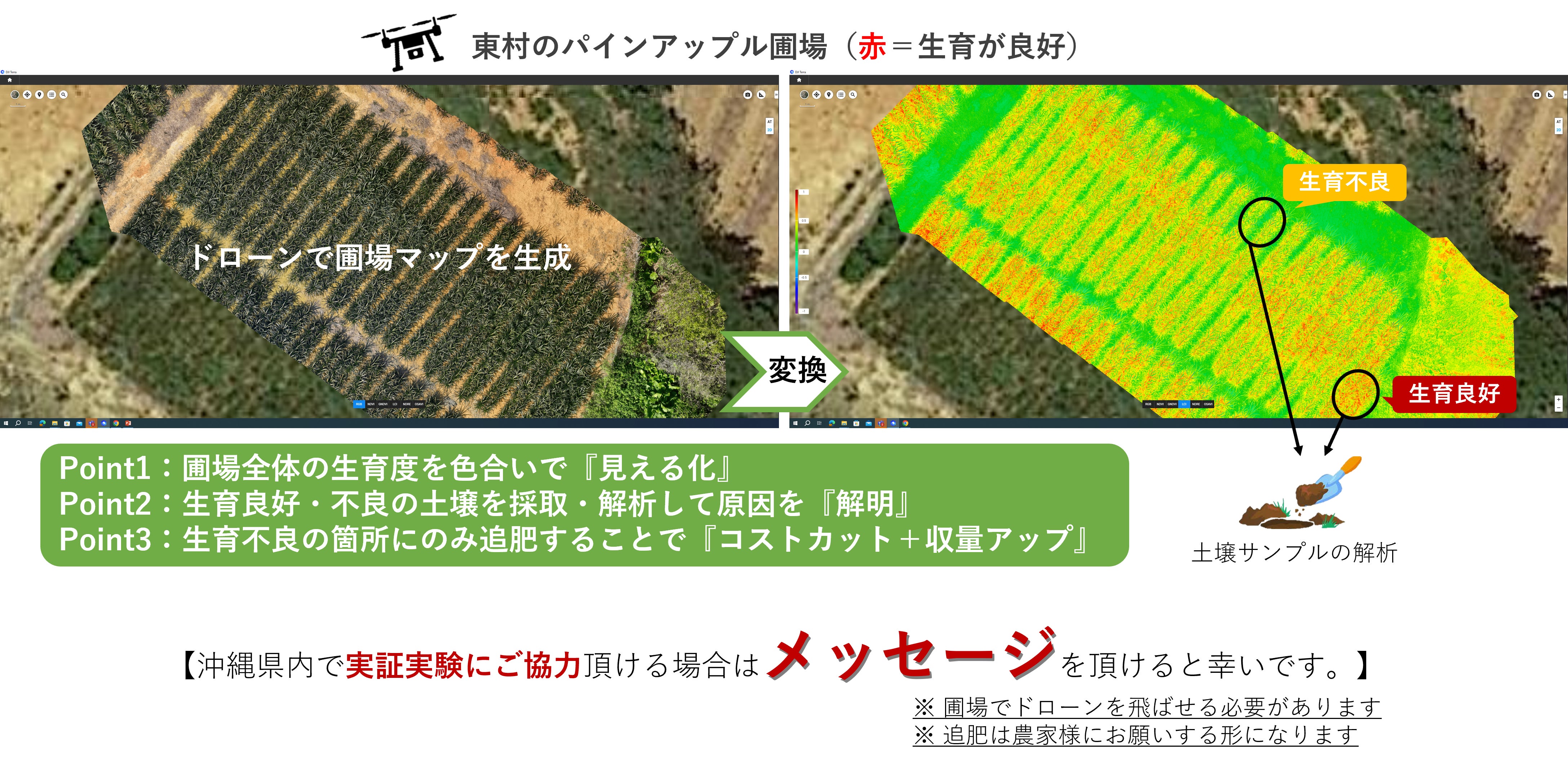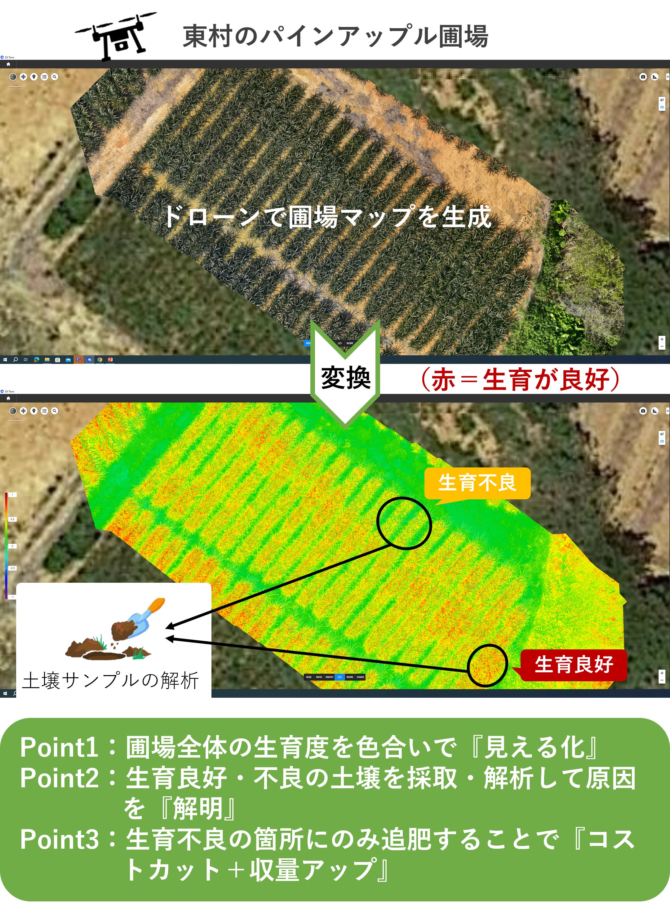 圃場の生育度を見える化して土壌診断を実施します。