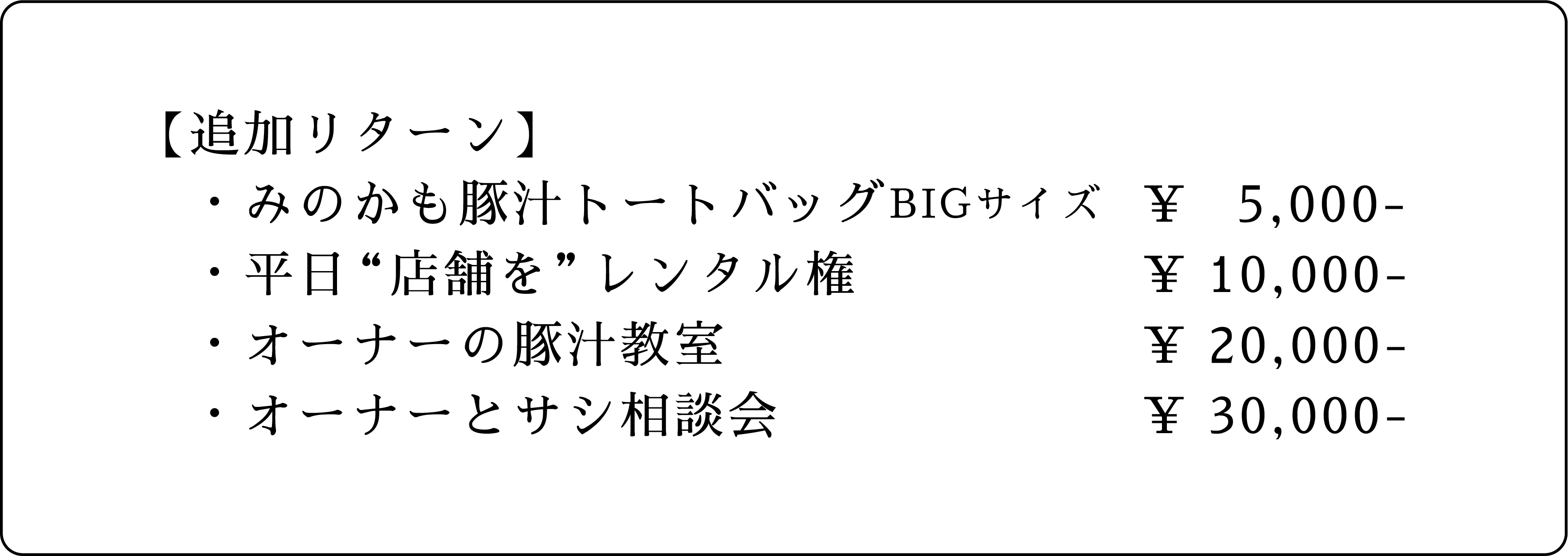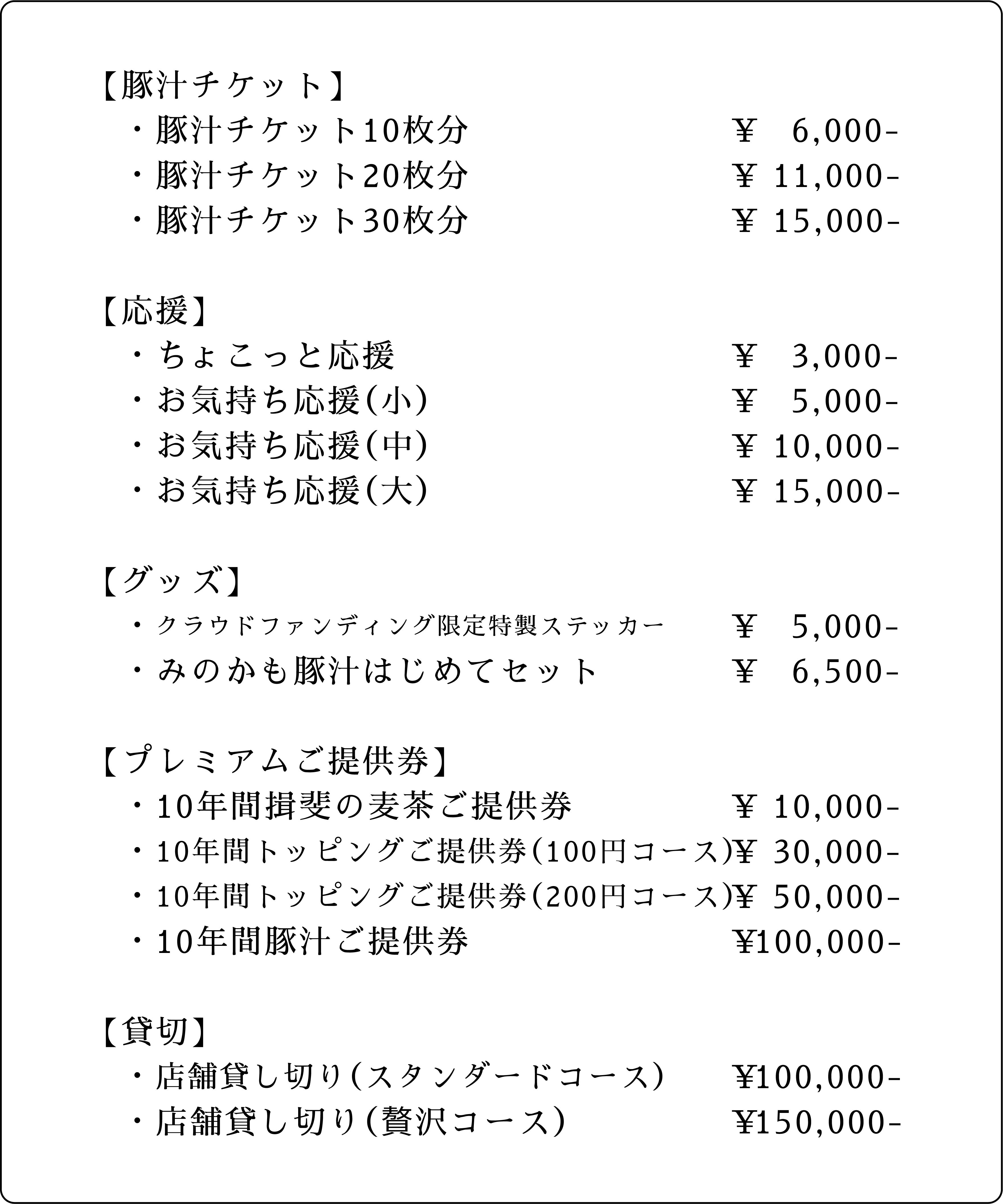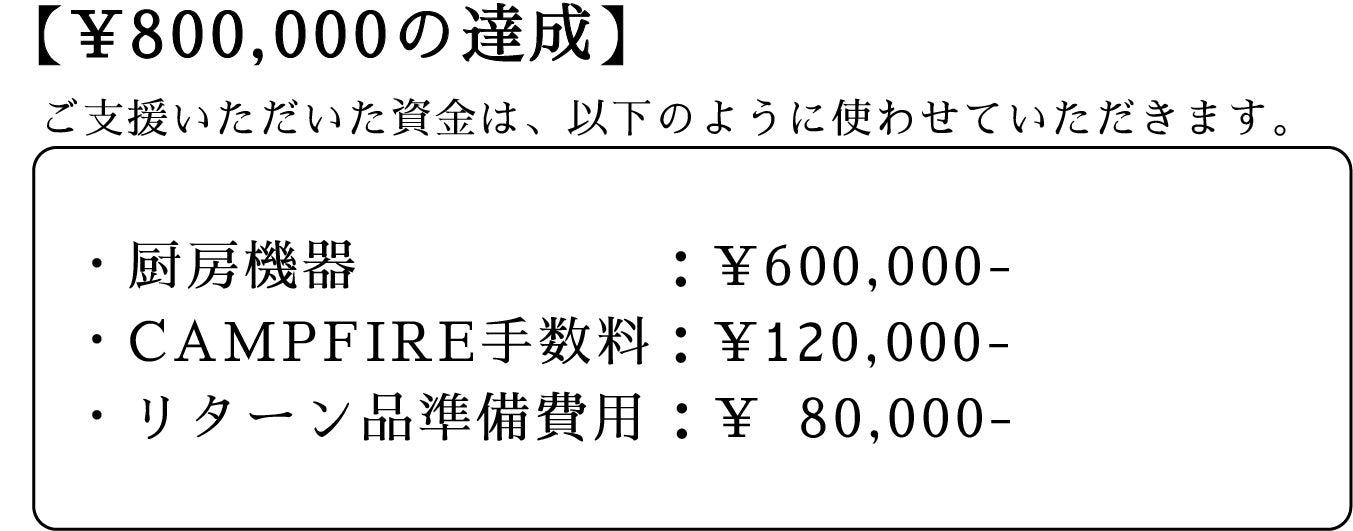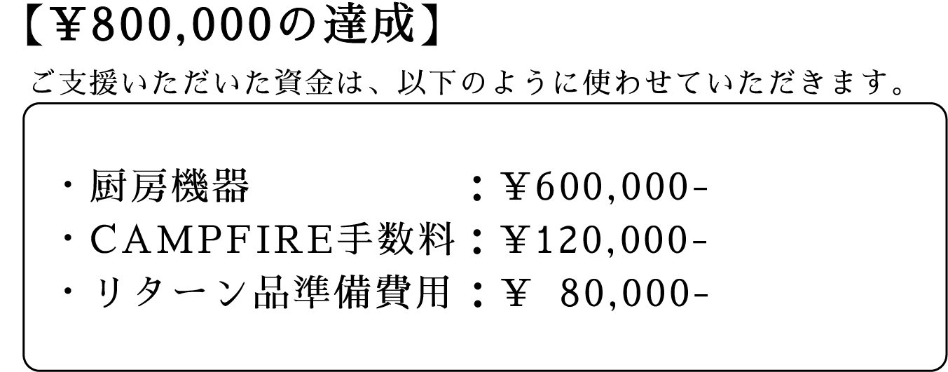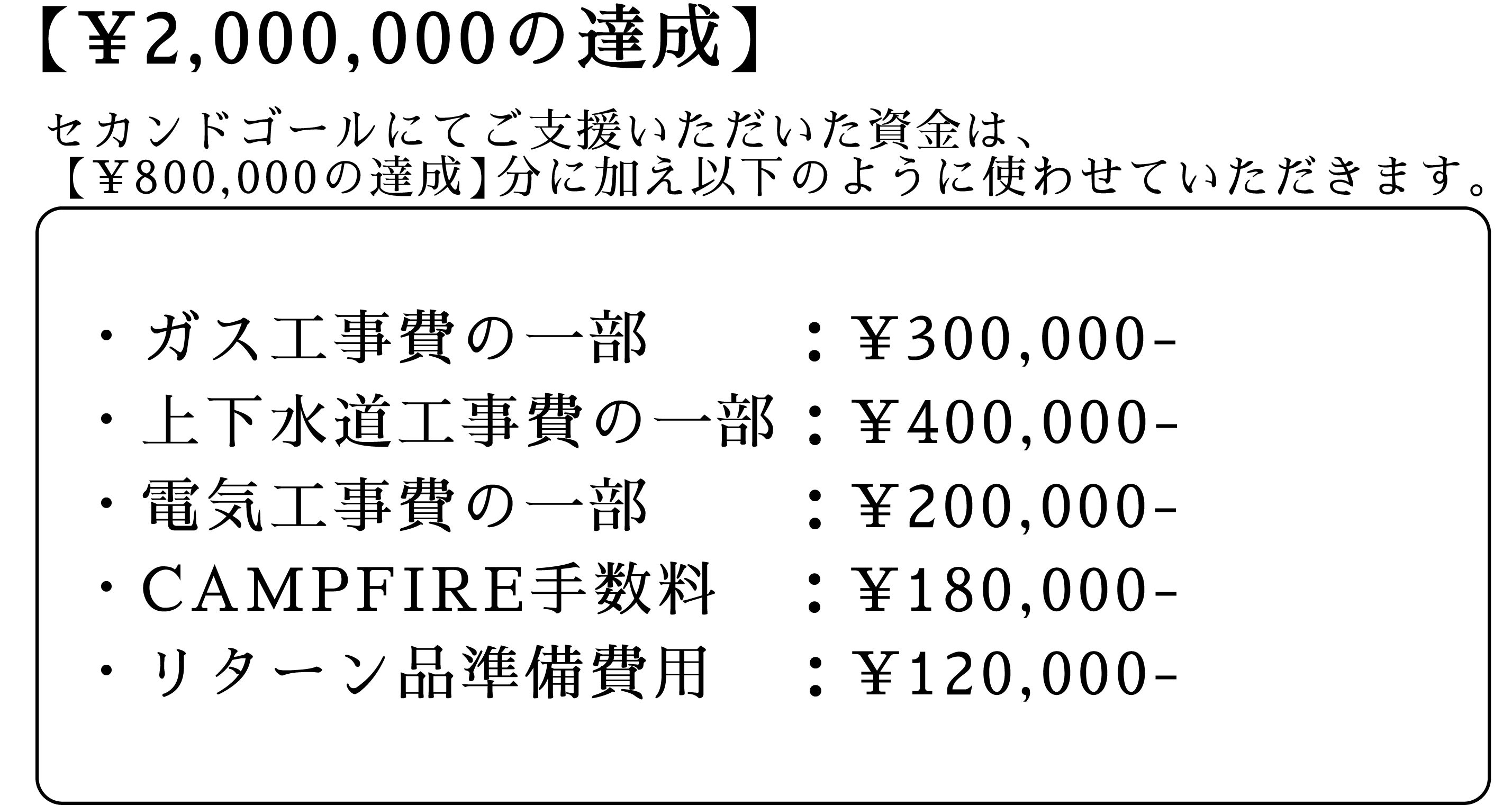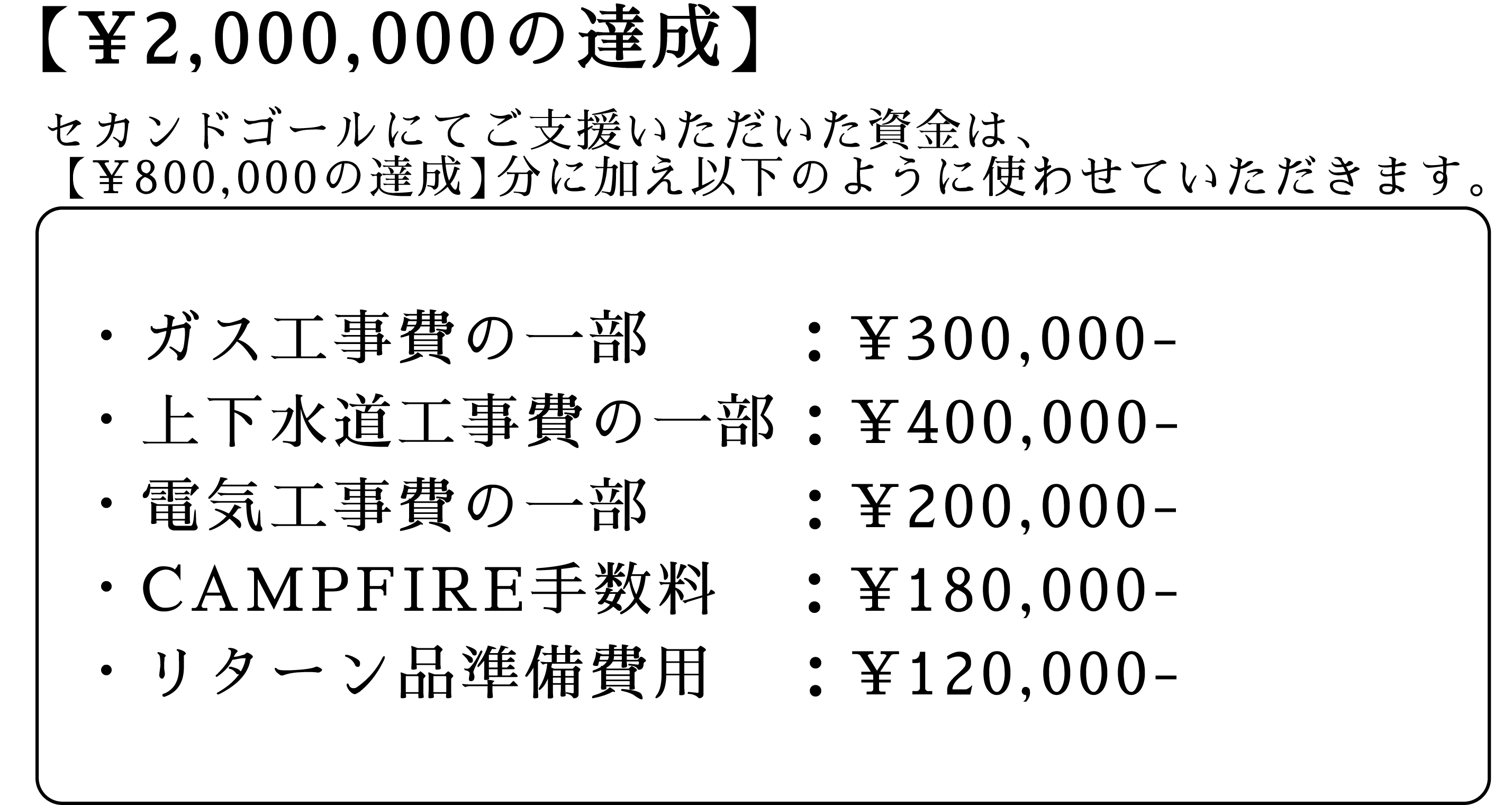 セカンドゴールでは200万に挑戦し、店舗のガスや電気・上下水道の工事費の一部に充当させていただきます。より良い場所をご提供できるよう精進して参りますので、残り期間もよろしくお願いいたします!!!