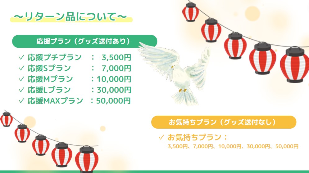 - ※リターンの協賛提灯、お名前呼びはお披露目会にて実施予定となります。
