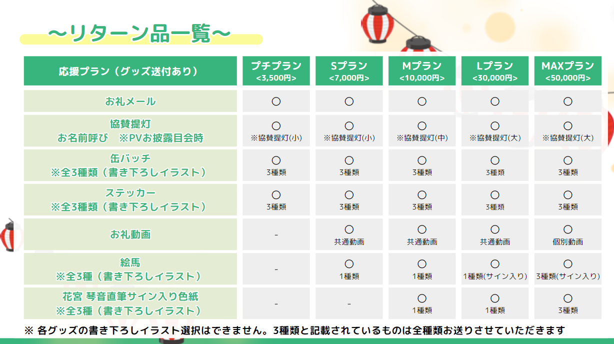 - 花宮 琴音の最古参ファンとして喜んでいただけるお礼(リターン)をご用意させていただきました。