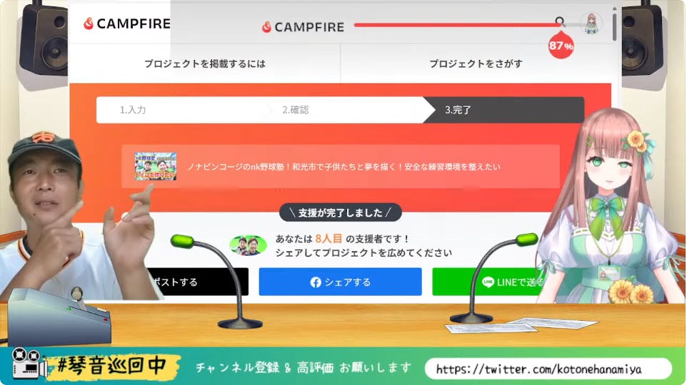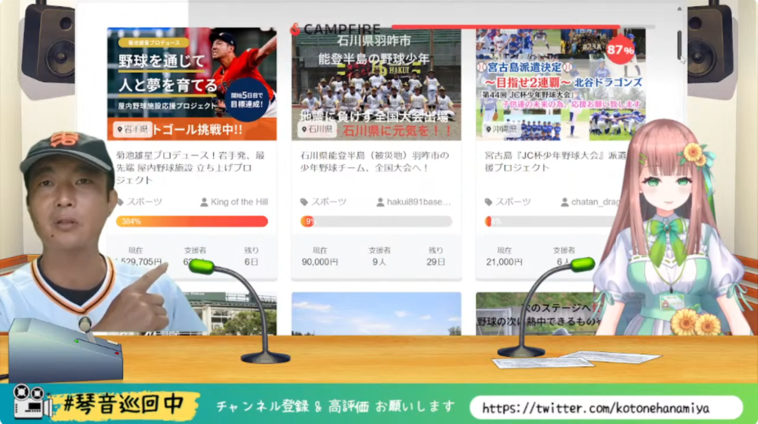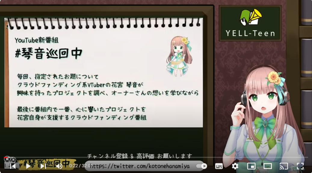 私が応援したクラウドファンディングプロジェクトに関連するYouTube収益の一部を花宮 琴音が視聴者代表としてプロジェクトに還元したい。