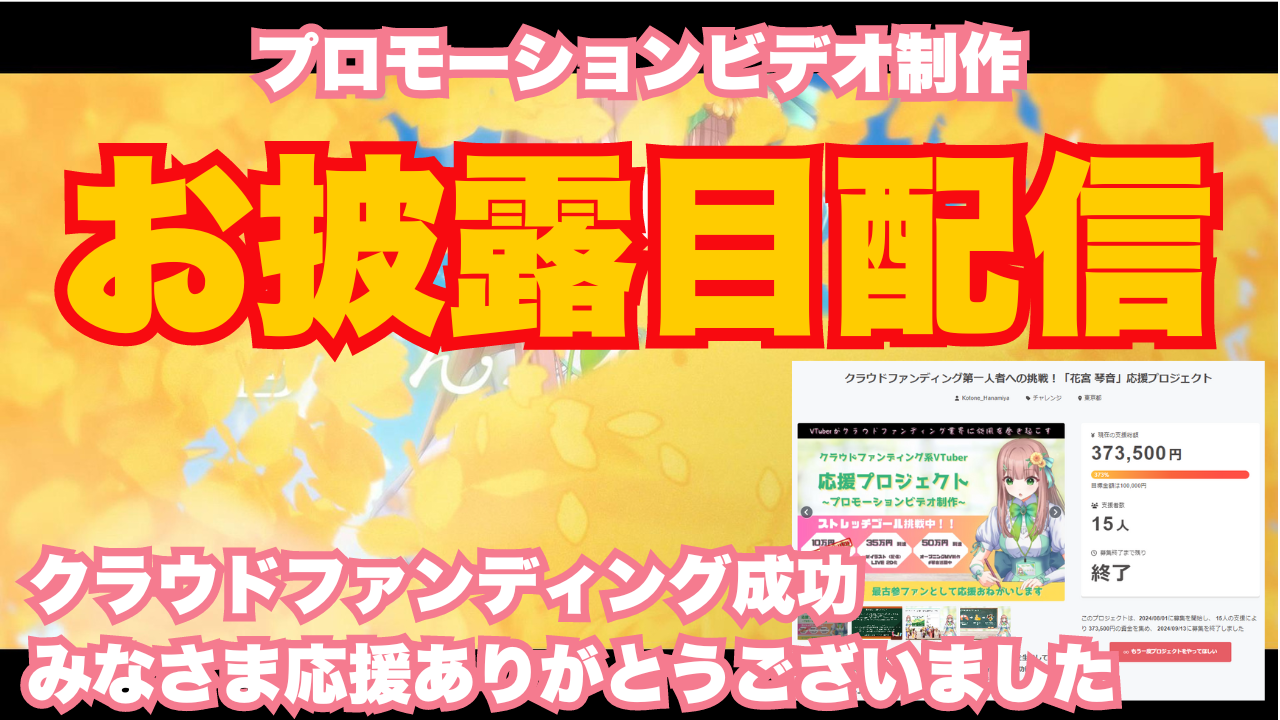 2024/10/16 11:00みなさま、おはこと~クラウドファンディング系VTuberの花宮琴音ですあらためまして、みなさまのご支援のおかげでクラウドファンディング第一人者への挑戦!「花宮 琴音」応援プロジェクト目標金額達成いたしました!そして、ストレッチゴールの配信イラストのLIVE 2D化も決定いたしました!本日の活動報告は、プロモーションビデオのお披露目配信のお知らせです10/30(水)21:00~プロモーションビデオのお披露目配信をライブで行います!https://youtube.com/live/nham4N86LF0どんな仕上がりとなったのか、みなさま是非お越しください!LIVE 2Dのお披露目ですが、現在ご担当いただいている方のスケジュール都合で早くて年内。年明けが現実的なスケジュールとしてご依頼をしております。完成/お披露目までもう少々お時間をいただけますと幸いです。本日の活動報告はここまでです!みなさま、楽しみにお披露目会をお待ちください! もっと見る