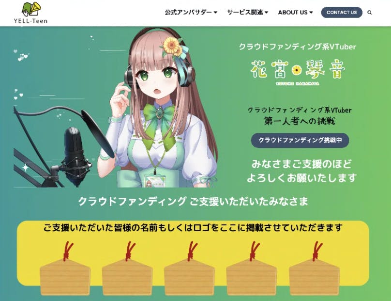 - →花宮琴音が所属する株式会社YELL-Teenに「花宮琴音クラウドファンディング特設ページ」にお名前もしくはロゴ(要望に応じてHPリンク)を掲載いたします。活動内容によりロゴを掲載できない場合がございます。