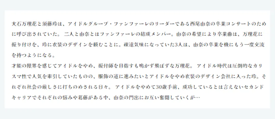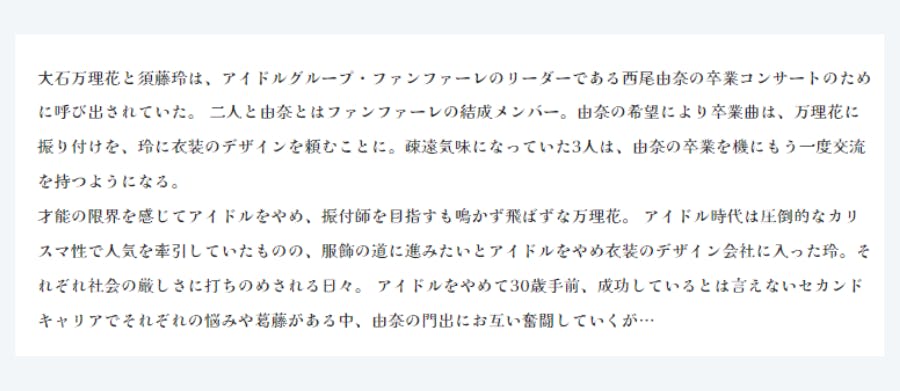 映画ファンファーレは、「夢と挫折が交錯する世界」を若年女性のアイドルからの卒業を通じて描きだしていく作品です。
